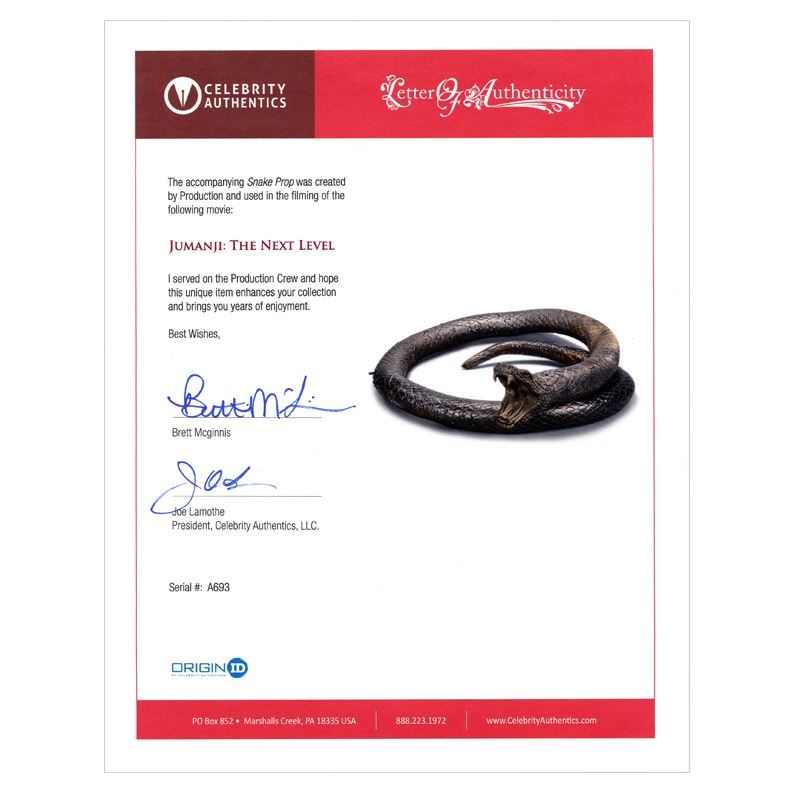 Direct from the set of 2019 Jumanji: The Next Level, starring Dwayne Johnson, Karen Gillan, Kevin Hart and Jack Black, is this screen used Snake from the scene where Nick Jonas navigates his way through perilous and life threatening obstacles to save the unicorn. Snake is astonishingly realistic, meticulously painted and measures about 10' long when uncurled. Snake was one of those affixed to the pole scenes which were a combination of cgi and this urethane, rubber critter! Includes Celebrity Authentics Letter of Authenticity personally signed by Production Crew Member verifying item's on screen use and provenance. This listing's featured images picture the exact item you will receive. Rare prop piece that would certainly make the ultimate (and startling) conversation piece!