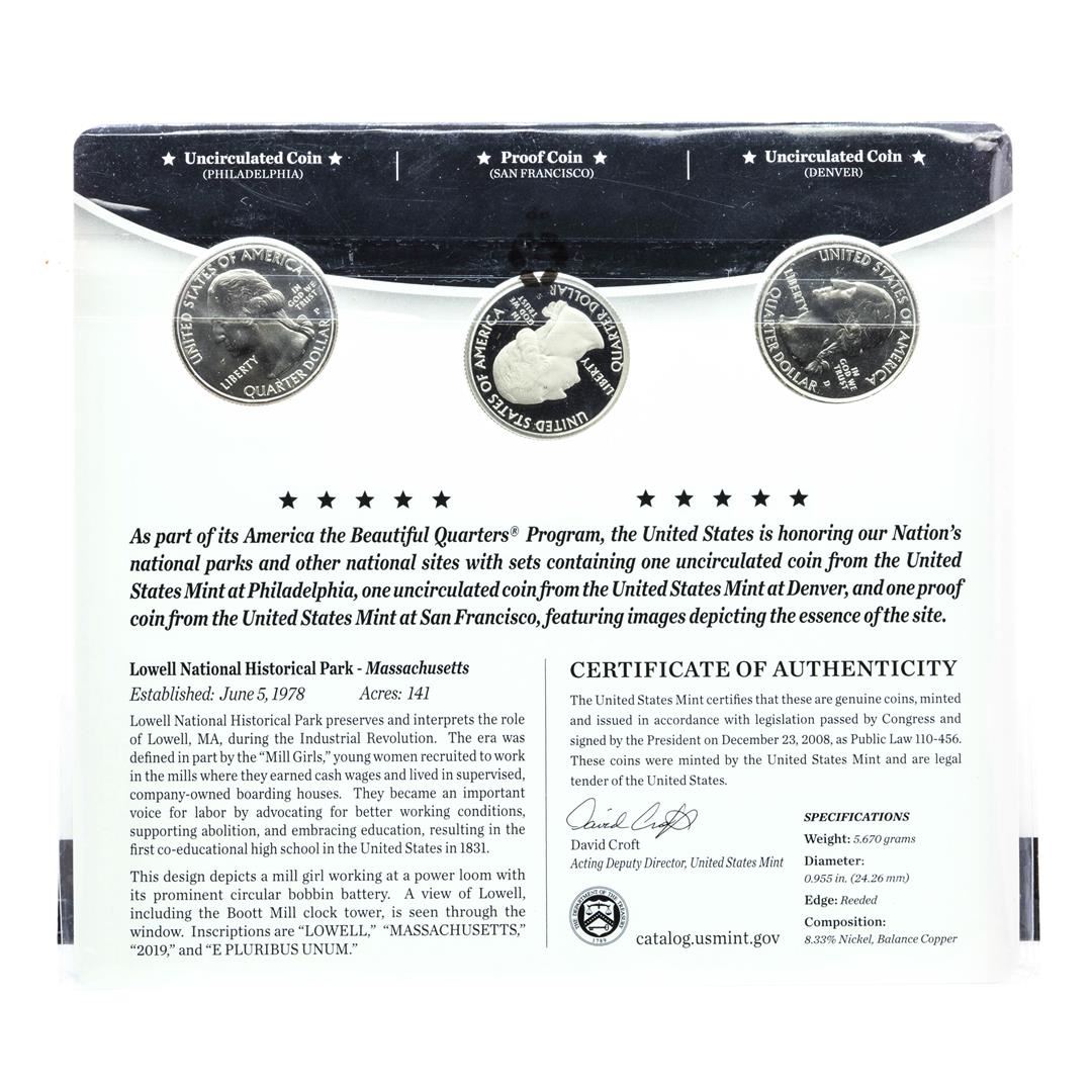 One 2019 Lowell National Historical Park American The Beautiful Three-Coin Quarter Set.