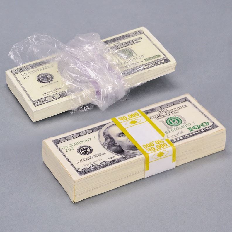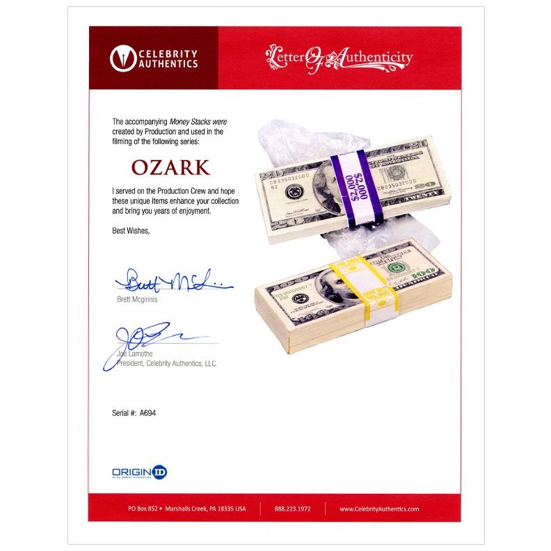 Direct from the exert of Season 3 of the Netflix hit series Ozark, starring Jason Bateman, are these two stacks of $2,000 USD and $10,000 USD fake money. Stacks are screen used 'blocks' of styrofoam meticulously finished to replicate cash and are exactly as they were used on set, including saran-wrap loosely around the stack of $2,000. Lightweight, stacks are very realistic and show nice, consistent product use. Includes Celebrity Authentics Letter of Authenticity personally signed by Production Crew Member verifying item's on screen use and provenance. This listing's featured images picture the exact items you will receive. Don't miss this rare opportunity to add some 'cash' to your collection from one of the hottest series in the past decade!