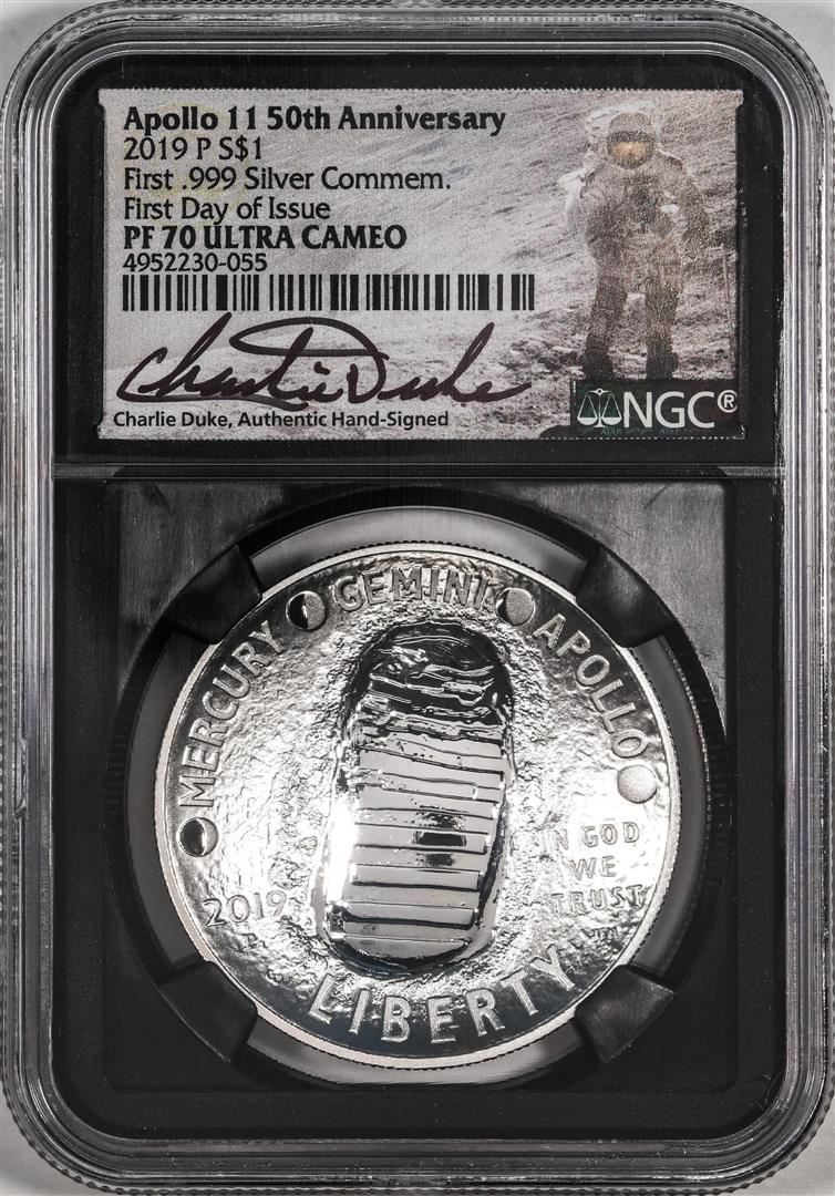 One 2019-P Apollo 11 50th $1 Proof Silver Dollar Coin NGC PF70 Ultra Cameo Duke Signed FDOI. NGC Certified.