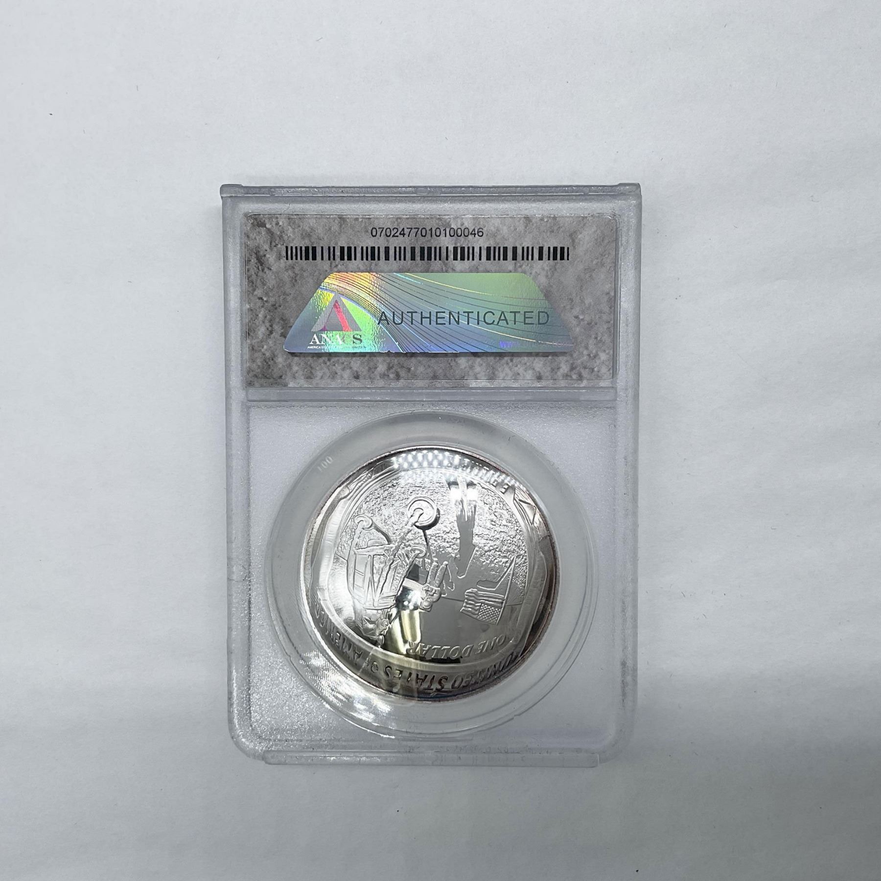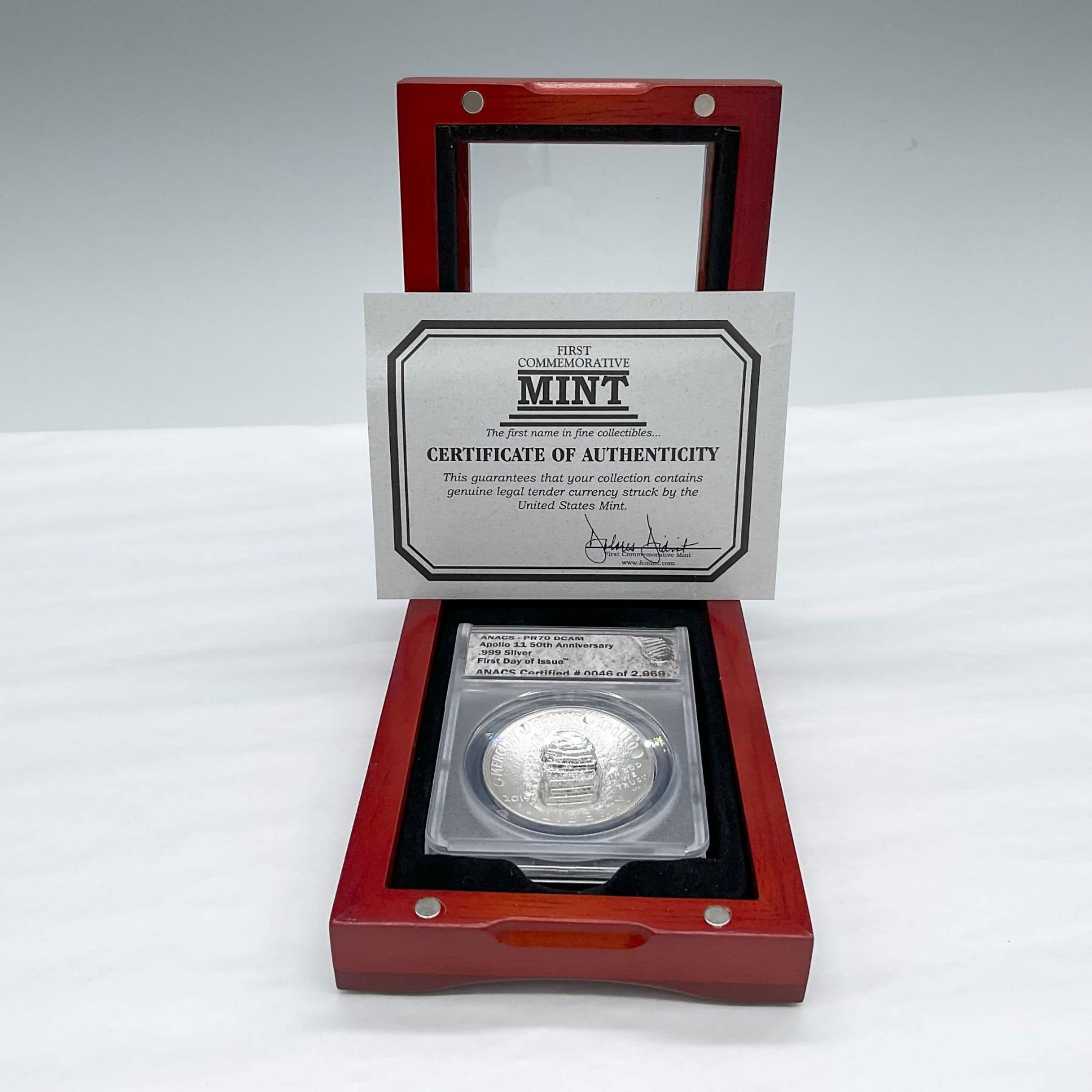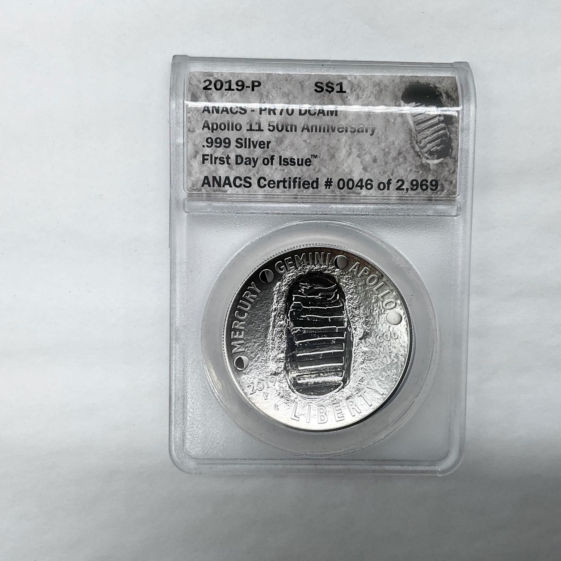 Philadelphia Mint. ANACS Graded and Slabbed PR70 DCAM. First Day Of Issue. Certified number 46 if 2969. .999 Silver. The obverse side features a footprint on the moon surface. The reverse side depicts a representation of a close-up of the famous Buzz Aldrin on the Moon photograph taken July 20, 1969. The coin is in a protective case. The case is approximately: 2.25"L x 0.5"W x 3.25"H. This item has its original box: 5"L x 3.5"W x 1.5"H.