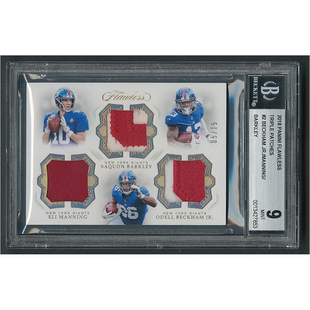 Graded by BGS MINT 9. Fine player-worn triple patch relic card of New York Giants stars Eli Manning, Saquon Barkley, and Odell Beckham, Jr., numbered 5/15, featuring red and white patch swatches from each player.