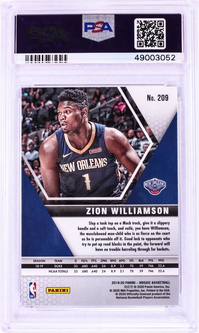 One 2019 Panini Mosaic Zion Williamson NBA Card #209 PSA Mint 9. PSA Certified.