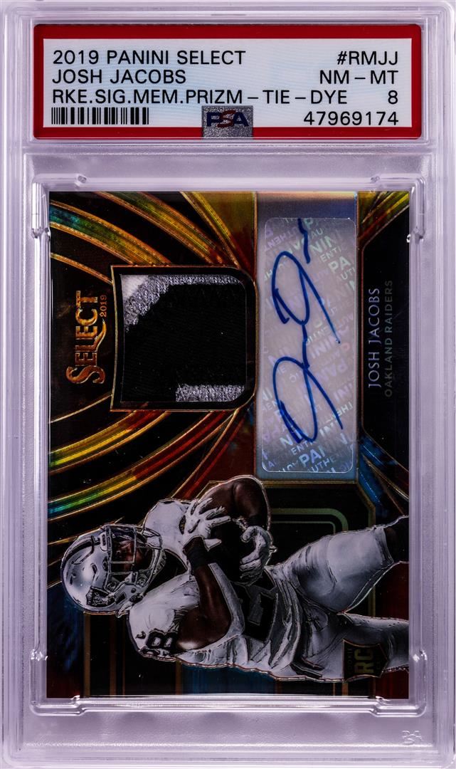 2019 Panini Select RPA Signature Tie-Dye Josh Jacobs NFL Card #RMJJ PSA Near Mint 8