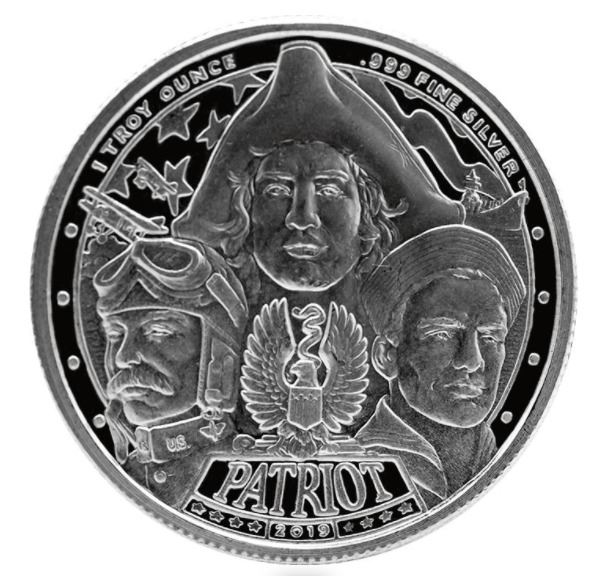 The obverse of the "War to End All Wars" WWI Patriot silver round features the Patriot Series emblem of a monument emblazoned with the word PATRIOT and 2019, topped by an American bald eagle in heraldic pose. The busts of a Minuteman, a WWI US Army Air Service pilot, and a WWII US Navy sailor, representing the Army, Air Force, and Navy, respectively, dominate the design. Flanking the Minuteman is two WWI fighter planes, and an Iowa-class WWII battleship. A stylized American flag provides a backdrop. The inscription 1 TROY OUNCE .999 FINE SILVER runs across the top border, bisected by the Minuteman's tricorn hat.