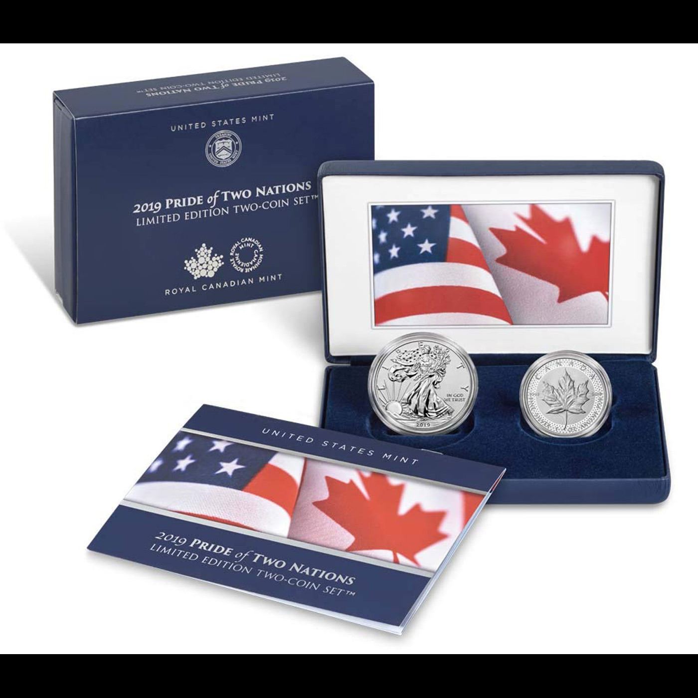 2019 Pride of Two Nations Limited Edition Two-Coin Set. The 2019 Jpride of Two Nations Limited Edition Two-Coin Set includes a 2019 silver Eagle, and a 2019 Canadian Maple Leaf. Both coins are .999 silver.