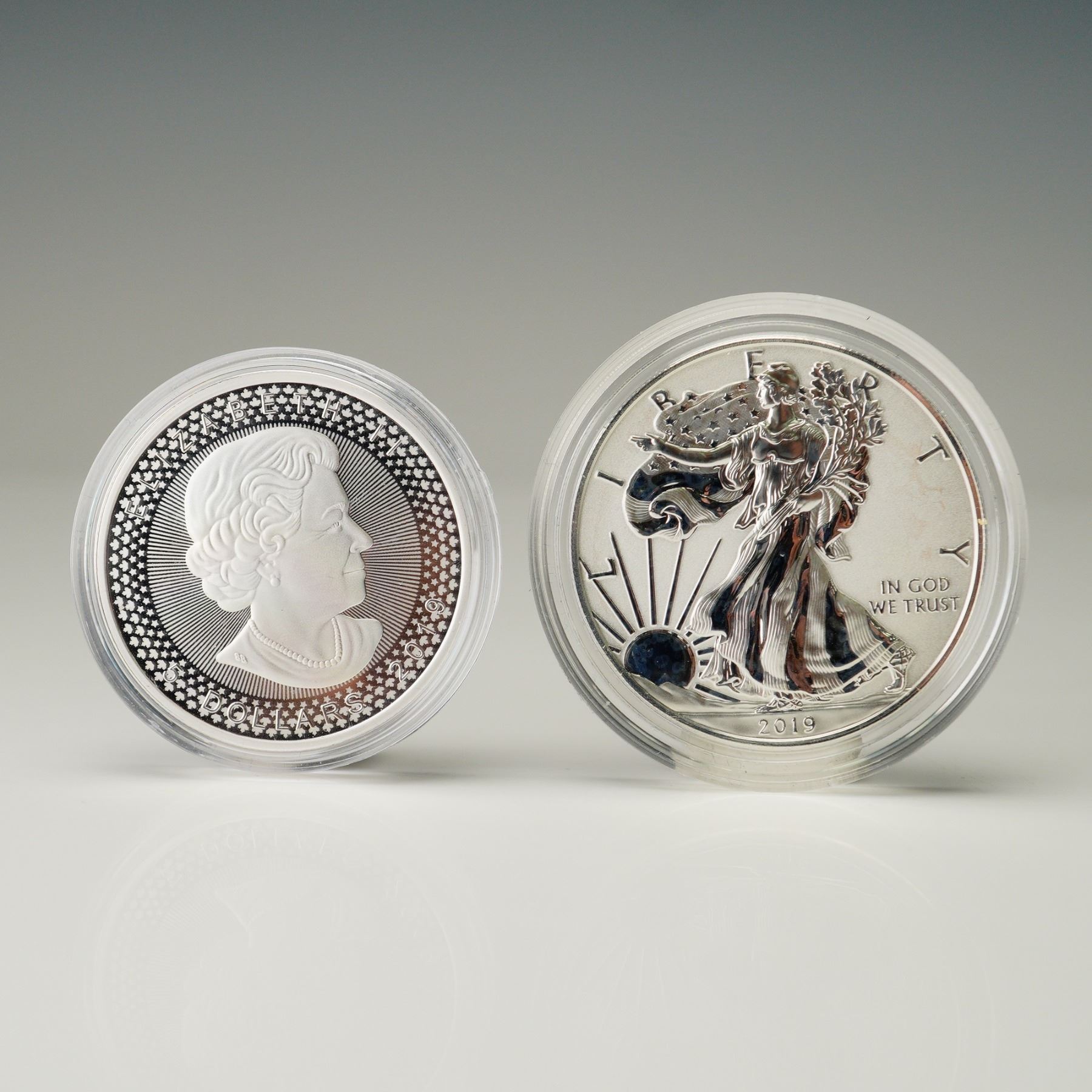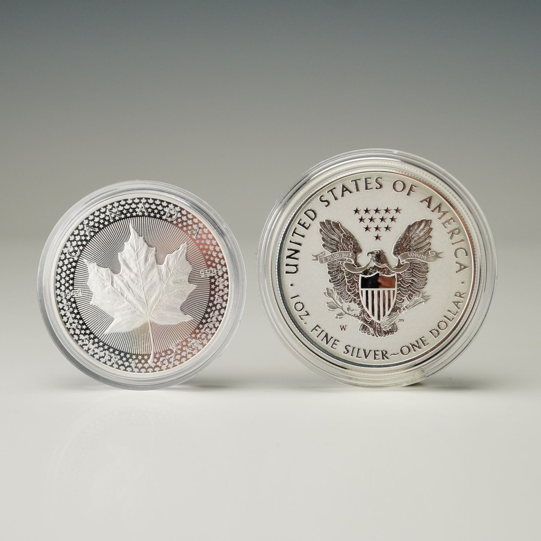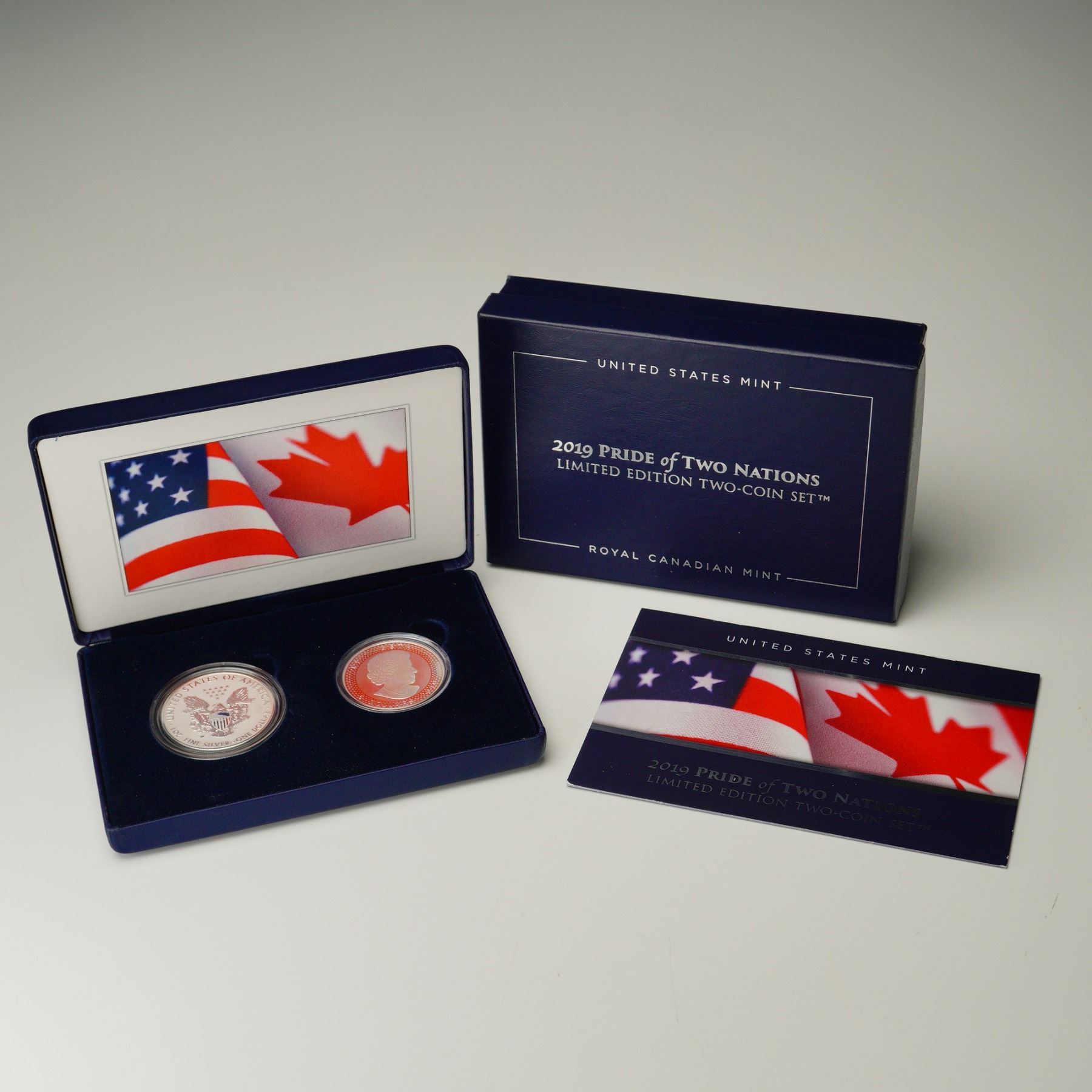 This 2-coin set marks the first collaboration between the United States Mint and the Royal Canadian Mint, issued in 2019 to celebrate the shared heritage and friendship between the two nations. It includes a 1oz American Silver Eagle in enhanced reverse proof and a 1oz Canadian Silver Maple Leaf in modified proof, each struck in .999 fine silver. The American Eagle features Liberty in full stride on the obverse and a heraldic eagle on the reverse, while the Maple Leaf displays Queen Elizabeth II and a detailed maple leaf with radial lines and symbolic border elements. The coins are encapsulated and presented in a display case with flag imagery and include a bilingual Certificate of Authenticity. Limited to only 110,000 sets across both mints, this is one of the lowest mintage Silver Eagles in the series.