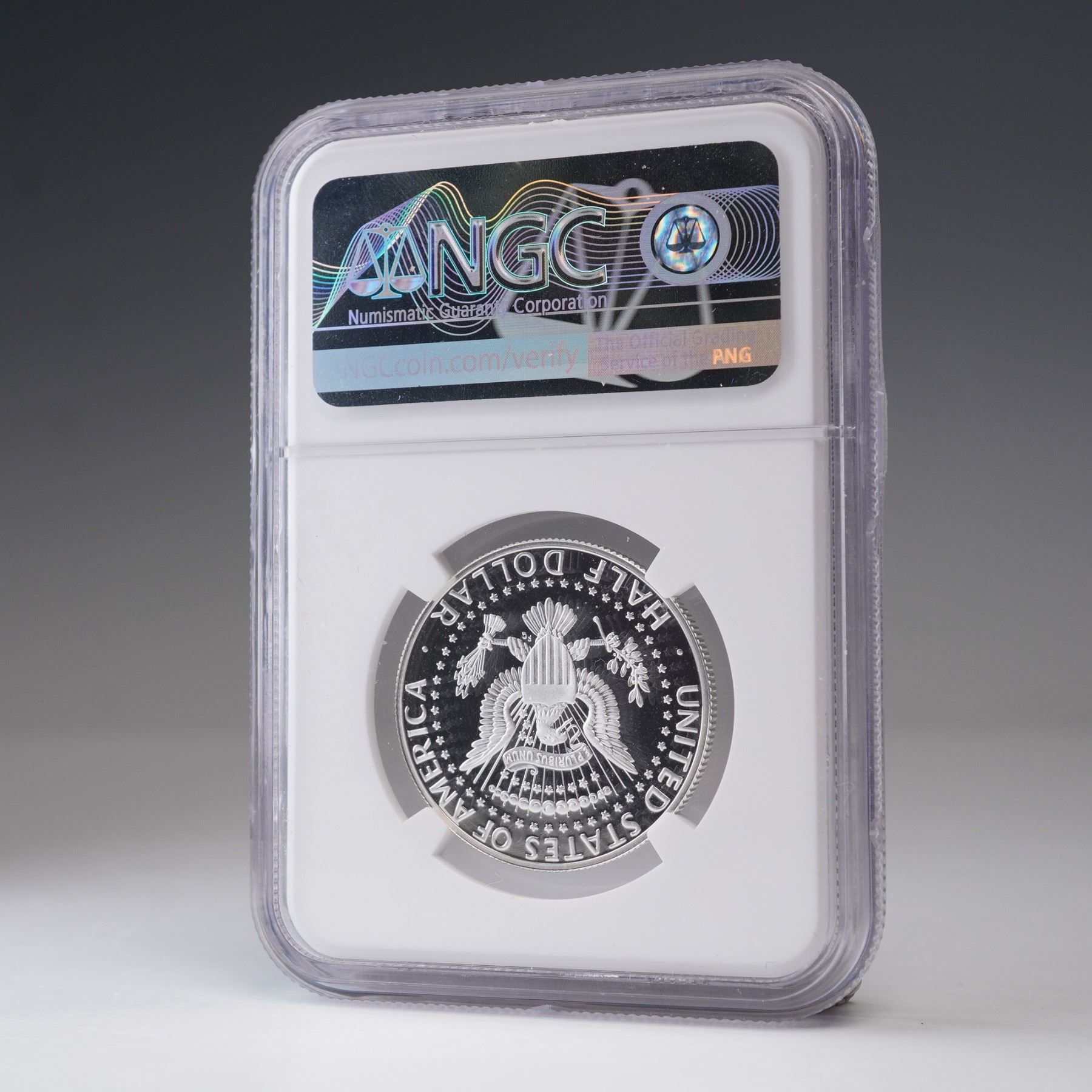 Struck in the first year of issue for the Kennedy half dollar series, this 1964 .999 silver proof coin certified by NGC with a Proof 67 grade. Struck at the San Francisco mint. The obverse bears the inscription IN GOD WE TRUST with the date 1964, surrounding the Kennedy bust. The reverse presents the heraldic eagle in stunning relief, surrounded by fifty stars and framed by the bold UNITED STATES OF AMERICA and HALF DOLLAR legends. Housed in a graded NGC holder for further preservation and authentication. Slab measures: 2.25"L x 0.25"W x 3.25"H. Coin diameter: 30.61 mm.