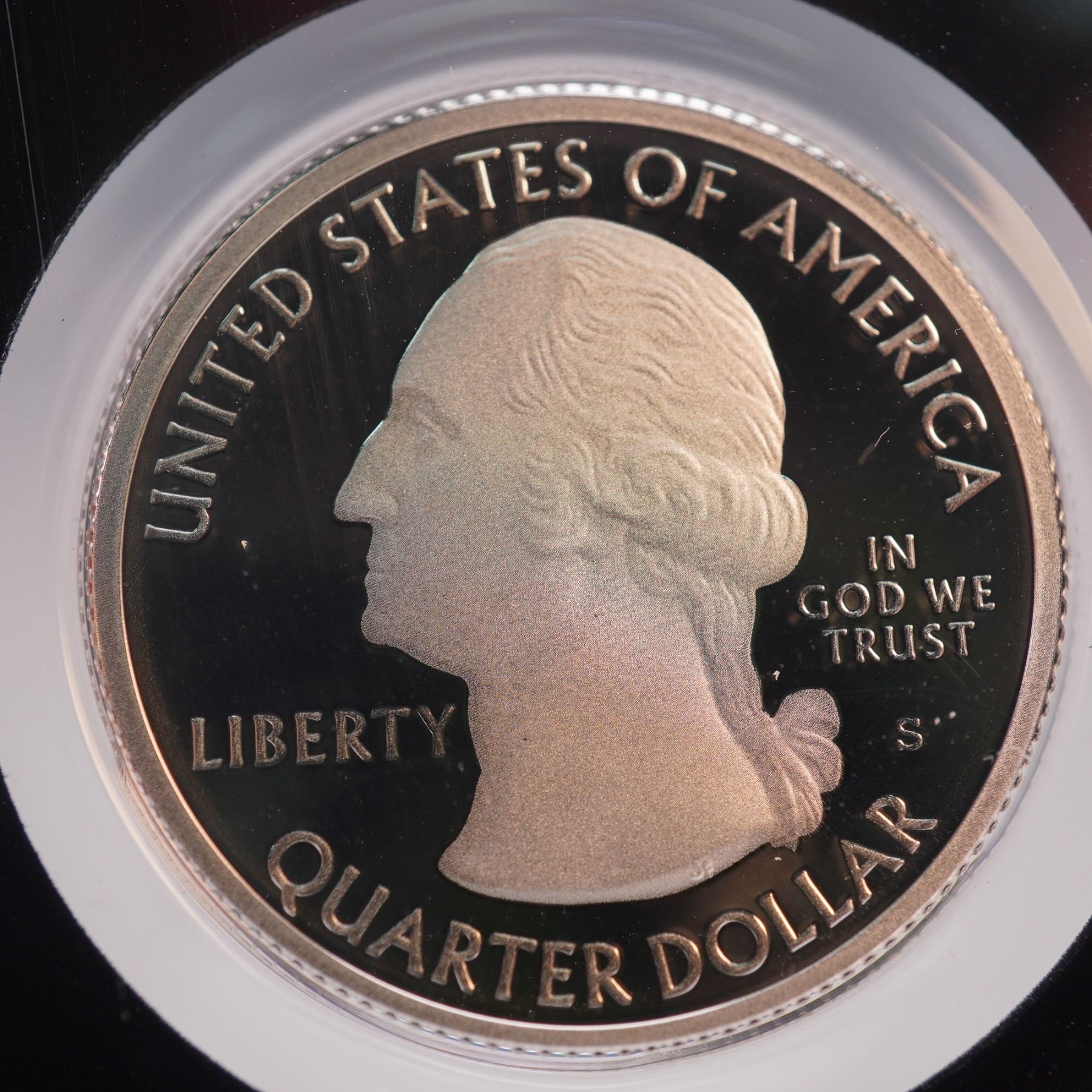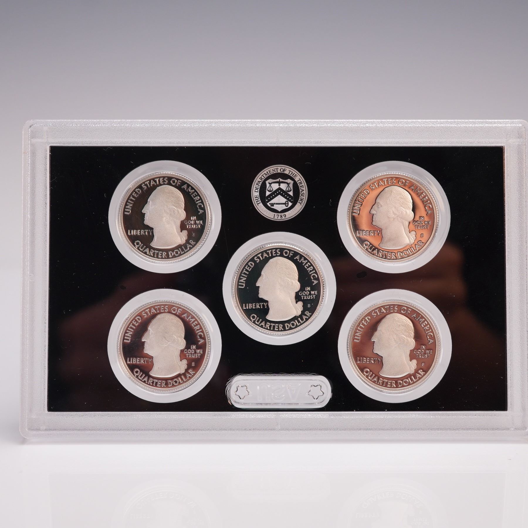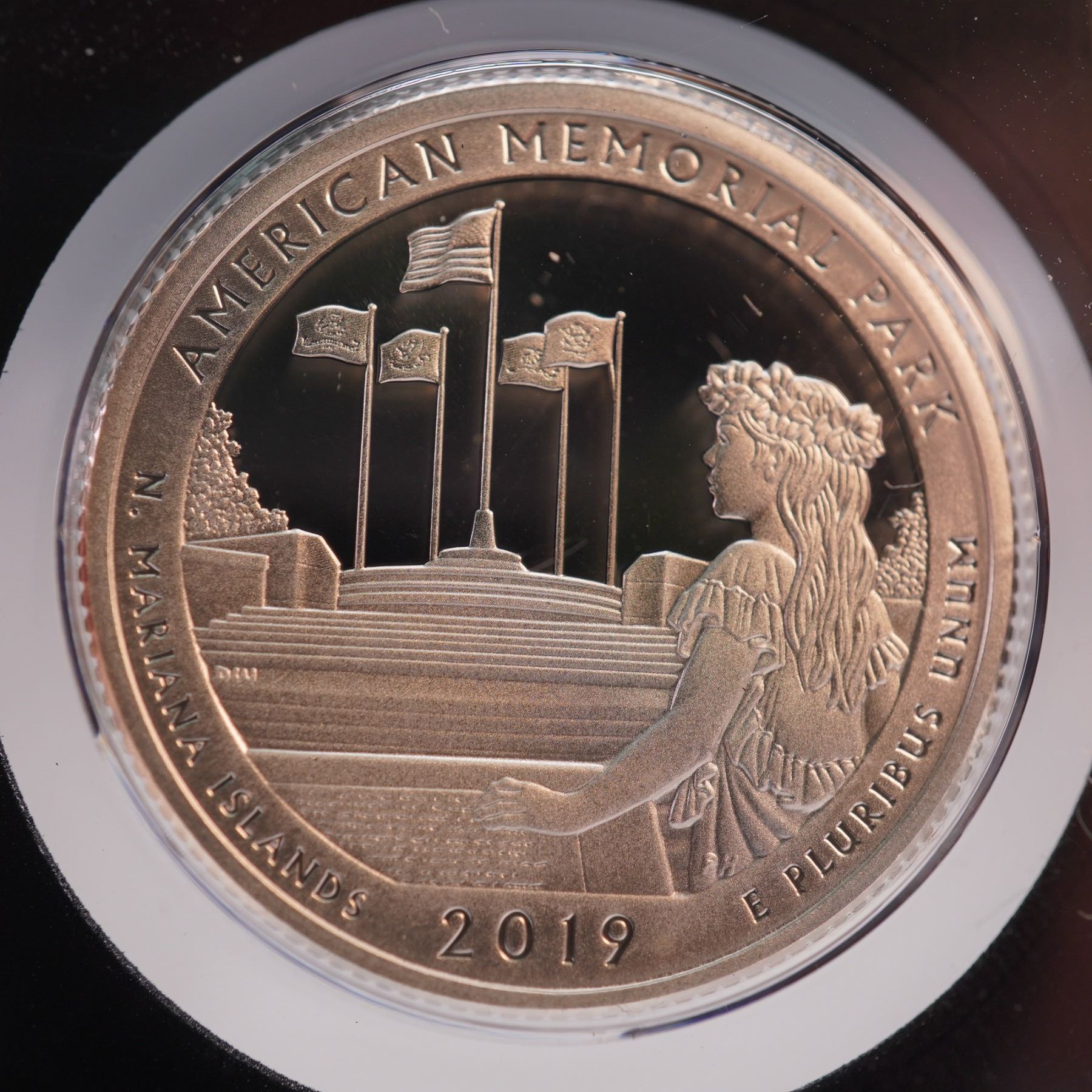 This 2019 United States Mint America the Beautiful silver proof set includes five 90% silver quarters housed in original hard plastic display packaging. Each coin features a sharply detailed proof finish with frosted devices and mirrored fields, depicting designs honoring Lowell National Historical Park (Massachusetts), American Memorial Park (Northern Mariana Islands), War in the Pacific National Historical Park (Guam), San Antonio Missions National Historical Park (Texas), and Frank Church; River of No Return Wilderness (Idaho). The obverses bear the standard Washington portrait in deep cameo relief. Accompanied by the official Department of the Treasury seal.