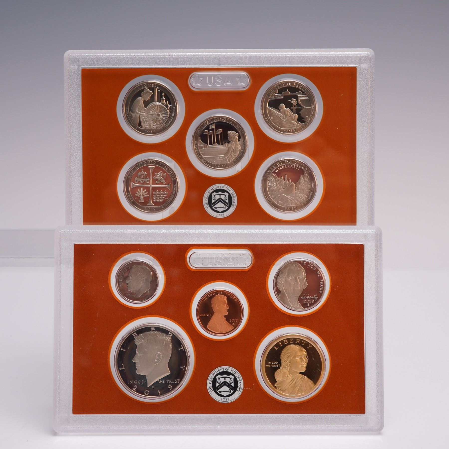 Complete 2019-S United States Mint Proof Set featuring ten standard proof coins along with the bonus 2019-W Reverse Proof Lincoln Cent. All coins bear the San Francisco "S" mint mark and are sealed in official U.S. Mint presentation holders. The set includes the Lincoln cent, Jefferson nickel, Roosevelt dime, Kennedy half dollar, and Native American dollar, along with five distinct America the Beautiful National Park quarter designs. The Roosevelt dime, Kennedy half dollar, and all five quarter dollars are struck in .999 fine silver. The reverse of the Native American dollar commemorates aerospace engineer Mary Golda Ross, the first known Native American engineer in the U.S. space program. Accompanied by a Certificate of Authenticity and original U.S. Mint packaging, this set also includes a separately packaged 2019-W Reverse Proof Lincoln Cent, the first Lincoln cent issued with the West Point mint mark. This item has its original box: 5.5"L x 3.5"W x 0.75"H.