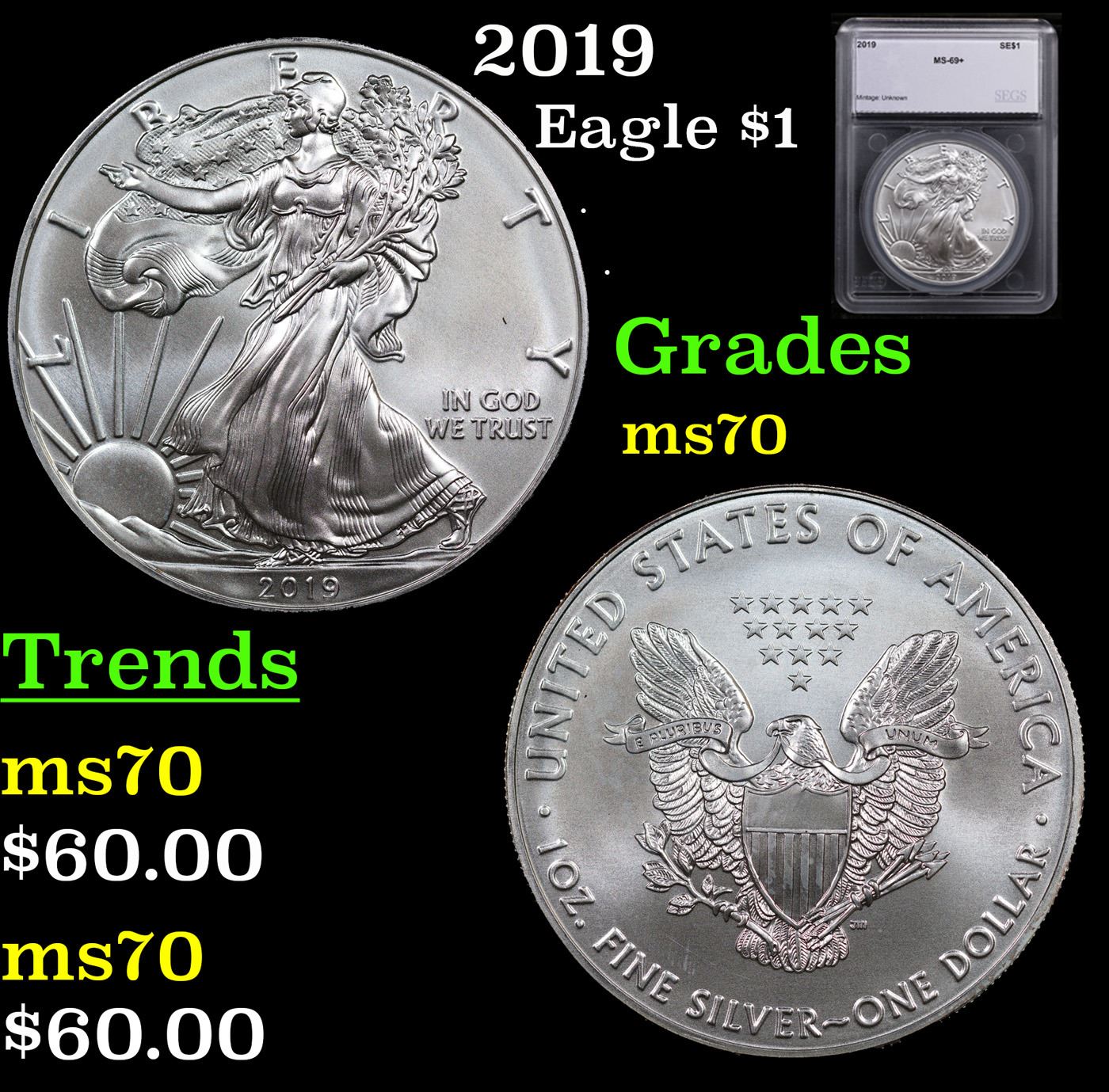 2019 Silver Eagle Dollar $1 Graded ms70 By SEGS.