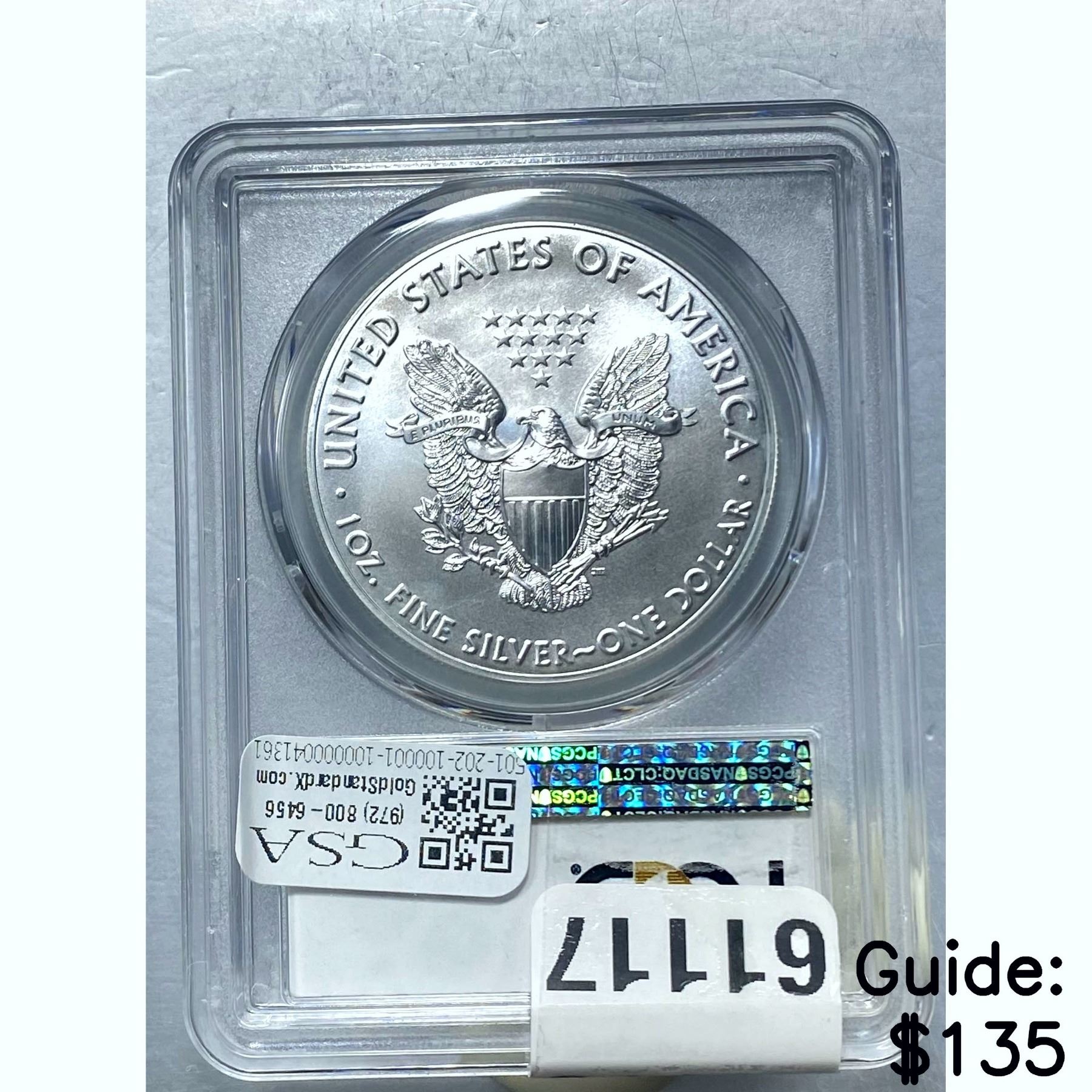 e. Coins sold referencing a third-party grading service are sold “AS IS” without any express or implied warranty, except for a guarantee by GSA that they are genuine. Removal or alteration of the holder, voids all of Bidder’s claims concerning that Product. Certain warranties may be available from the grading services and Bidders are referred to them for further details: Numismatic Guaranty Corporation (NGC), PO Box 4776, Sarasota, FL 34230, www.ngccoin.com/services/writtenguarantee.asp; Professional Coin Grading Services (PCGS), PO Box 9458, Newport Beach, CA 92658, www.pcgs.com/guarantee.html; ANACS, 6555 S. Kenton St., Ste. 303, Englewood, CO 80111; and Independent Coin Grading Co. (ICG), 7901 East Bellview, Ave., Suite 50, Englewood, CO 80111.