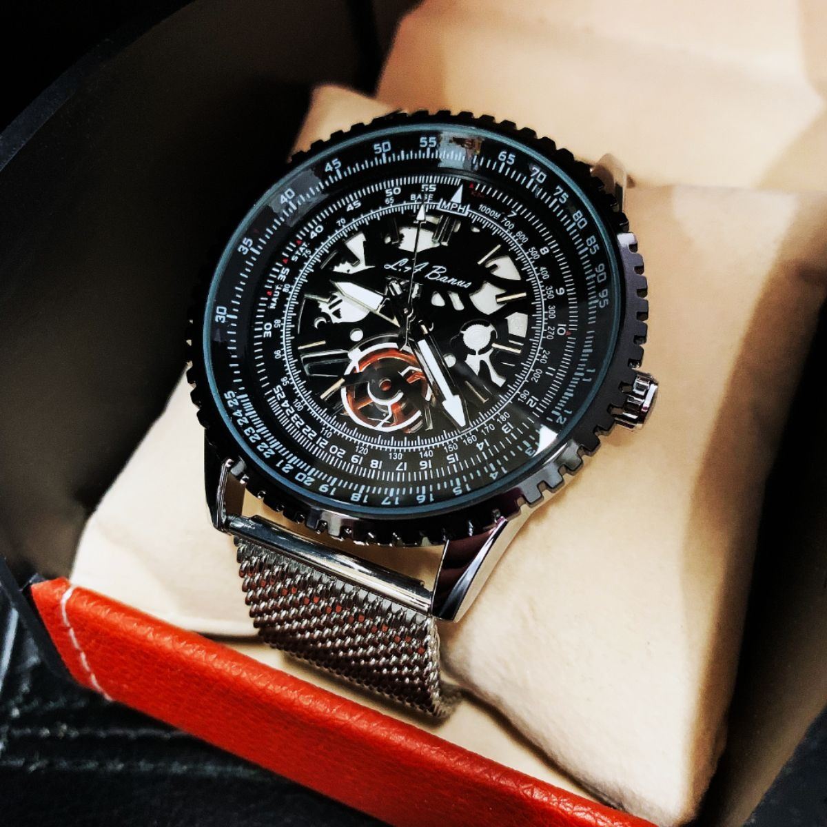Mens L.A Banus Formal Black Skeleton Dial Stainless Steel Band Watch. Remarkable Precision From A German Hand Made Watch Company That Takes Pride In The Craftsmanship Of There Time Pieces. The Watch Is Accompanied By A Mounting Pillow & Stitch Leather Casing From L.A Banus. This Offers Safe Keeping For Your Watch In You Collection. Please View Photos For Further Details.