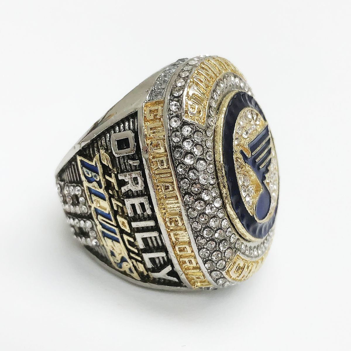 The 2019 St. Louis Blues NHL Stanley Cup Ring - (Reilly). Decorated With Inset Stones On Gold Gilt Base, This Championship Ring Commemorates The St. Louis Blues NHL Stanley Cup Run.  The Western Conference champion St. Louis Blues defeated the Eastern Conference champion Boston Bruins four games to three to win their first championship, in their 51st season of play (not including the 2004–05 lockout), ending the third longest championship Drought in league history. This Highly Collectible Ring Demonstrates Championship Craftsmanship & Signifies What It Takes To Be A Champion In The NHL. View Photos For Further Details