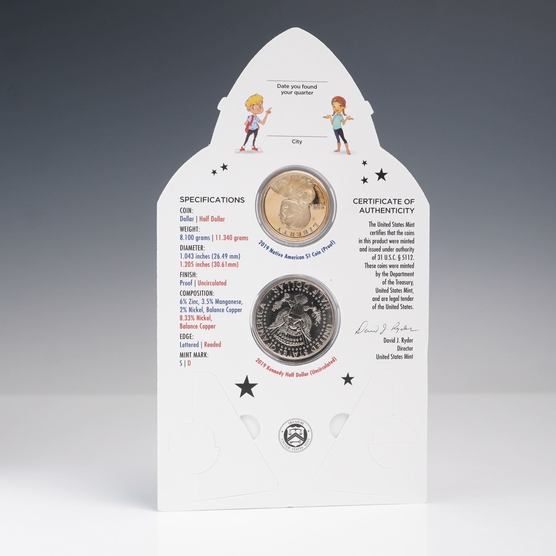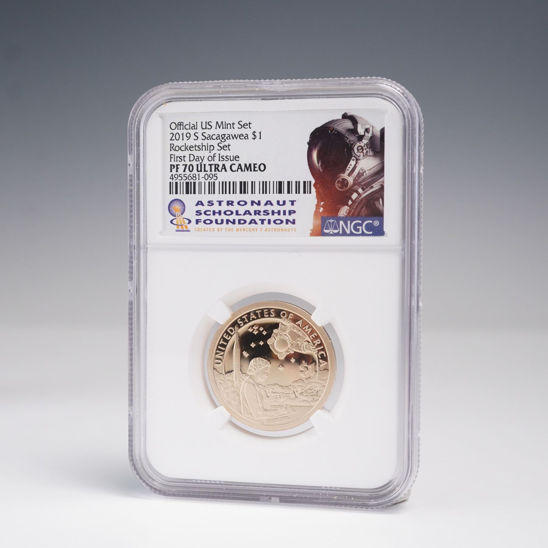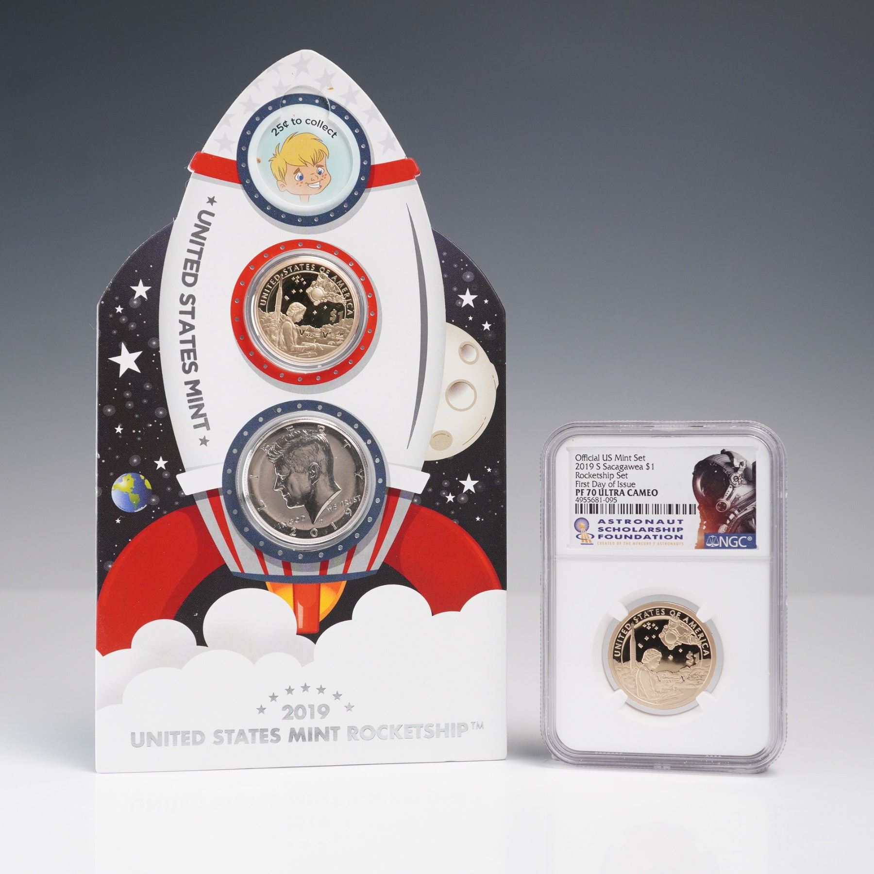 This two-piece numismatic offering from the United States Mint includes a vibrant 2019 Rocketship-themed display folder housing an uncirculated Kennedy half dollar and a proof Native American Sacagawea dollar coin. The dollar honors Native American contributions to space exploration, with a detailed reverse design depicting engineer Mary Golda Ross in front of a rocket launch. Also included is a matching NGC-graded 2019-S Sacagawea dollar in Proof 70 Ultra Cameo condition, labeled "First Day of Issue" and issued in partnership with the Astronaut Scholarship Foundation. The packaging is designed to appeal to young collectors, featuring a glow-in-the-dark rocket motif and full specifications on the reverse.