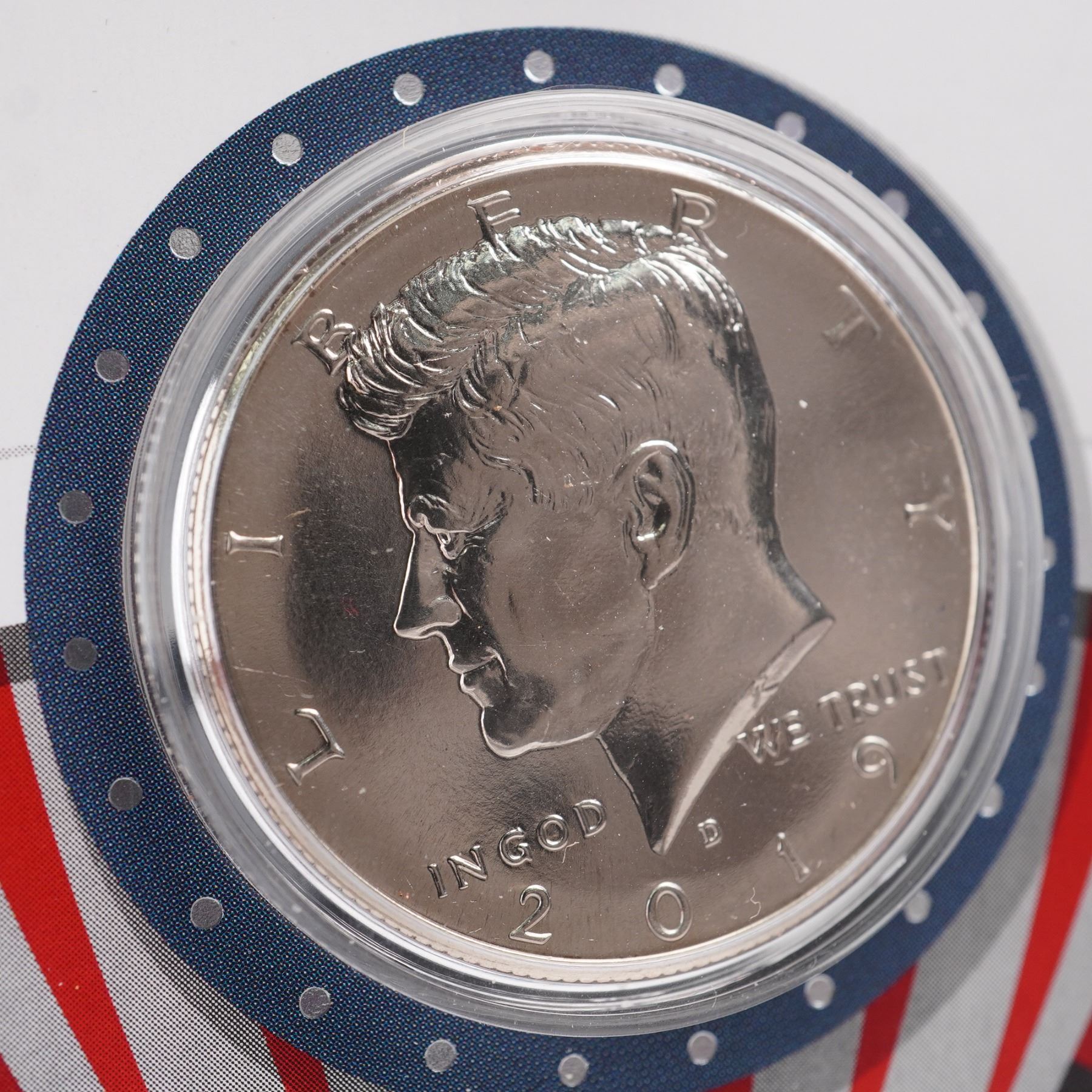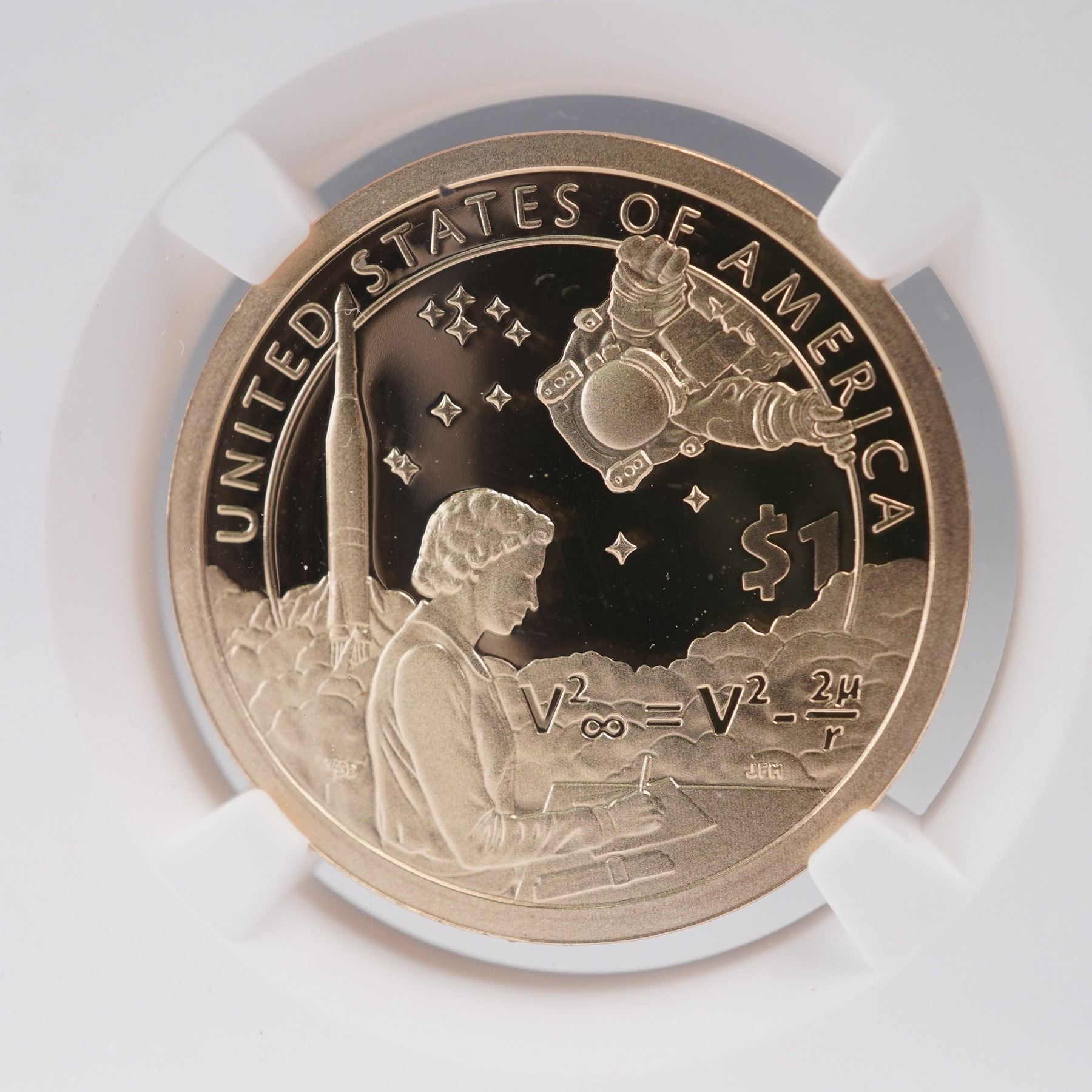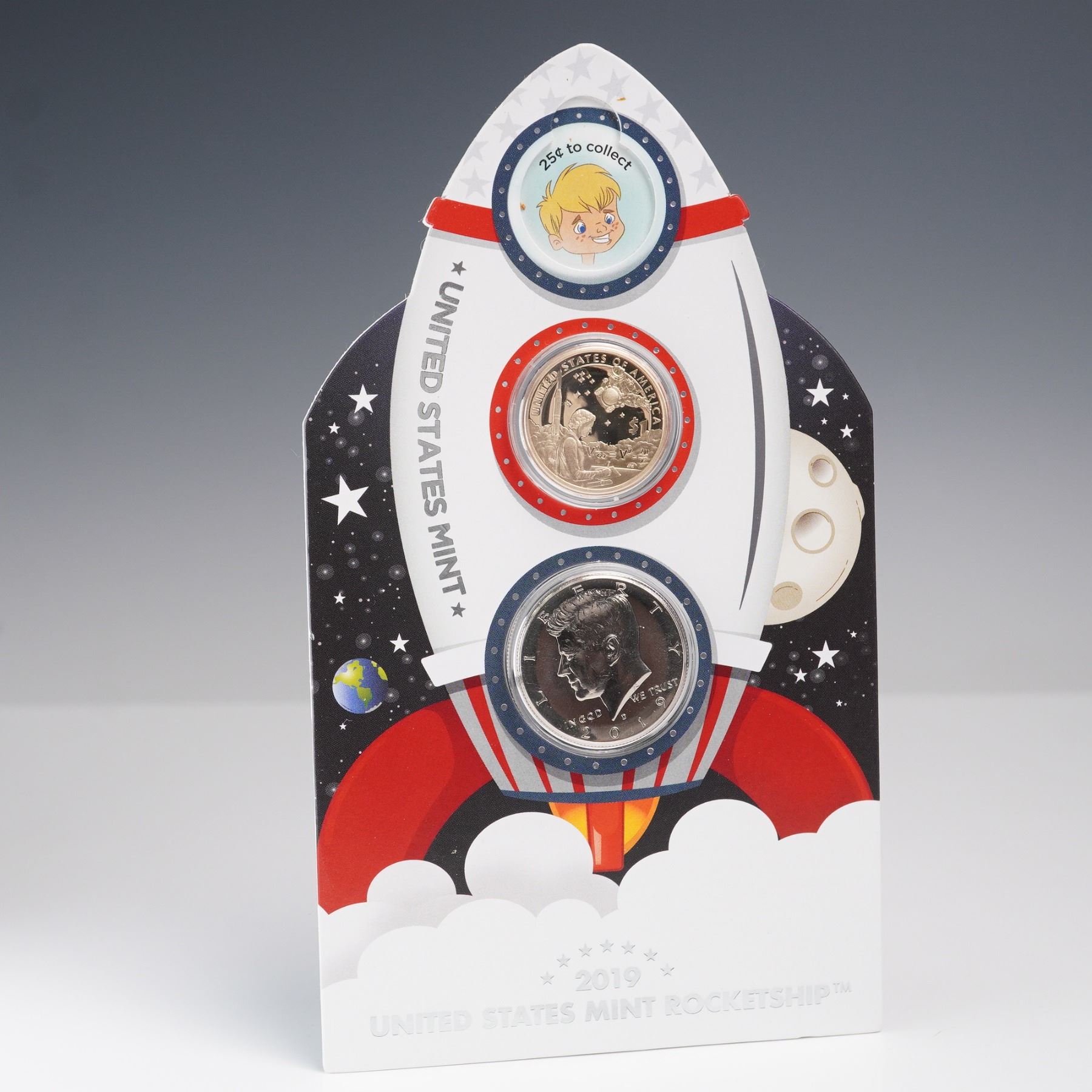 This two-piece numismatic offering from the United States Mint includes a vibrant 2019 Rocketship-themed display folder housing an uncirculated Kennedy half dollar and a proof Native American Sacagawea dollar coin. The dollar honors Native American contributions to space exploration, with a detailed reverse design depicting engineer Mary Golda Ross in front of a rocket launch. Also included is a matching NGC-graded 2019-S Sacagawea dollar in Proof 70 Ultra Cameo condition, labeled "First Day of Issue" and issued in partnership with the Astronaut Scholarship Foundation. The packaging is designed to appeal to young collectors, featuring a glow-in-the-dark rocket motif and full specifications on the reverse.
