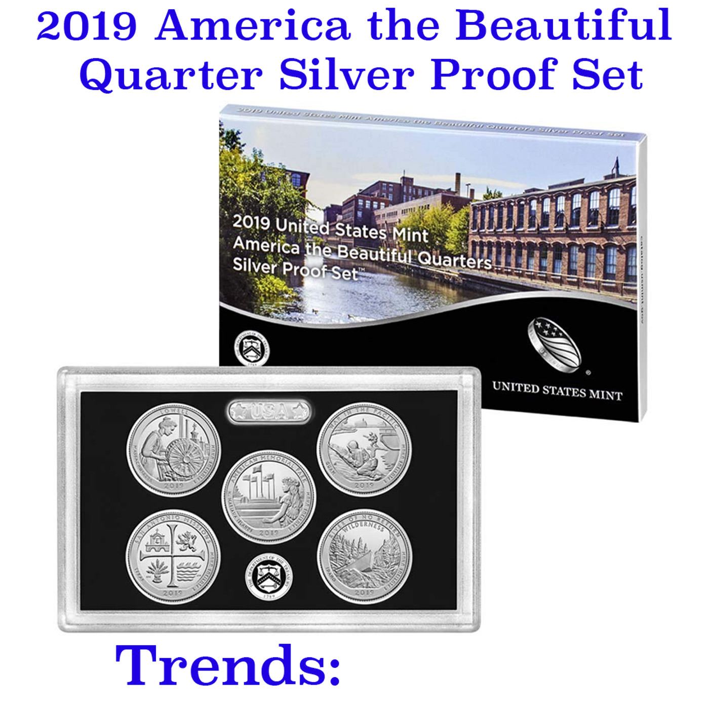 2019 United States Mint America The Beautiful Quarter Proof Set. This set includes five proof quarters from the America the Beautiful Quarters® Program honoring Lowell National Historical Park in Massachusetts; American Memorial Park in the Northern Mariana Islands; War in the Pacific National Historical Park in Guam; San Antonio Missions National Historical Park in Texas; and Frank Church River of No Return Wilderness in Idaho.