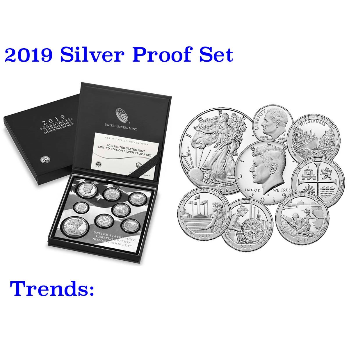 2019 United States Mint Limited Edition Silver Proof Set 8 coins. The 2019 United States Mint Limited Edition Silver Proof Set contains eight coins with stunning proof finishes. The coins included in this set are: (1) American Eagle One Ounce Silver Proof Coin with the “S” mint mark (5) Quarters from the America the Beautiful Quarters Program honoring Lowell National Historical Park in Massachusetts; American Memorial Park in the Northern Mariana Islands; War in the Pacific National Historical Park in Guam; San Antonio Missions National Historical Park in Texas; and Frank Church River of No Return Wilderness in Idaho. (1) Kennedy half dollar (1) Roosevelt dime Coins are struck in 99.9 percent fine silver. The American Eagle Silver Proof Coin with the “S” mint mark is a collector version of the official United States Mint American Eagle Silver Bullion Coin and contains one troy ounce of 99.9 percent fine silver. The classic Walking Liberty design by Adolph A. Weinman, features a full-length figure of Liberty in full stride, enveloped in folds of the flag, with her right hand extended and branches of laurel and oak in her left. Inscriptions are "LIBERTY," "IN GOD WE TRUST," and "2019".