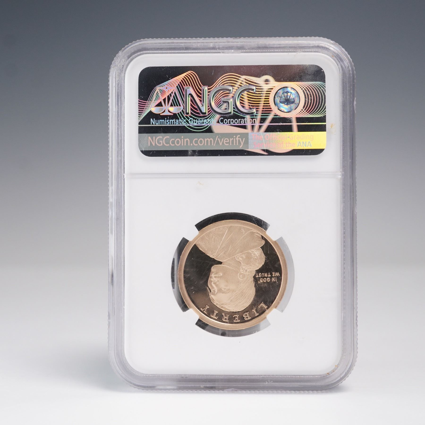 A charming 2019 United States Mint Rocketship Set, containing a proof Sacagawea dollar and a Kennedy half dollar embedded in a colorful cardboard rocket ship holder aimed at young collectors. Accompanying this is a certified 2019-S Sacagawea dollar from the same Rocketship release, graded PF70 Ultra Cameo by NGC and bearing the special Astronaut Scholarship Foundation label. The reverse of the dollar showcases Mary Golda Ross and Native American astronauts, commemorating Native contributions to space exploration, while the obverse features the classic Sacagawea portrait.