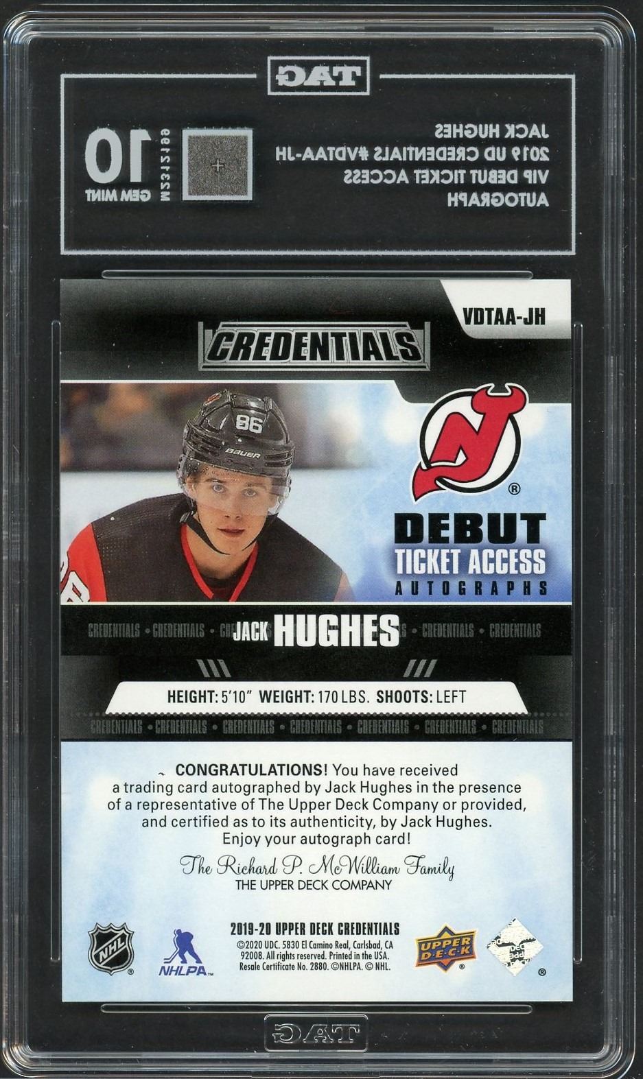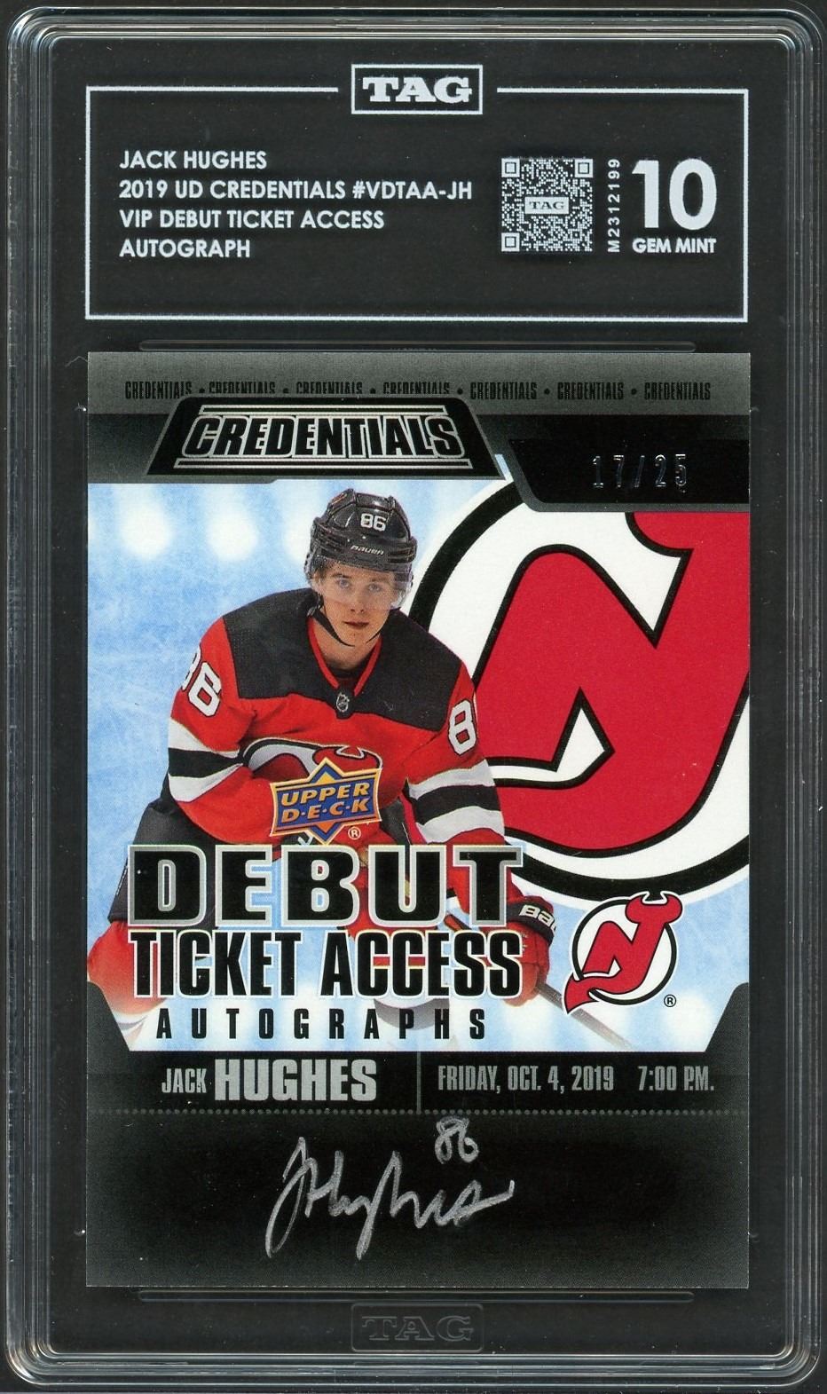 2019 UD Credentials rookie autograph of star New Jersey Devils forward (and Hughes brother) Jack Hughes. Graded a Gem Mint 10 by TAG.