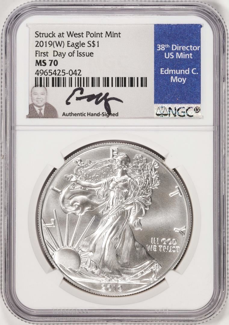 One 2019(W) $1 American Silver Eagle Coin NGC MS70 FDOI Moy Signature West Point Mint. NGC Certified.