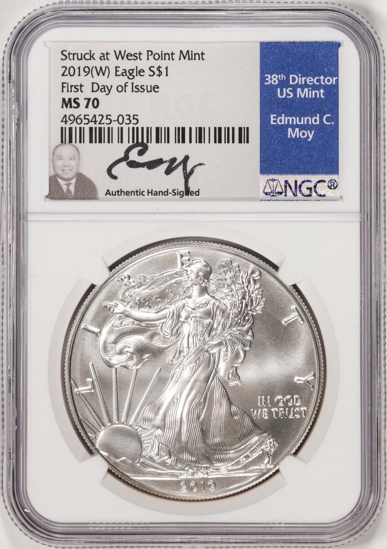 One 2019(W) $1 American Silver Eagle Coin NGC MS70 FDOI Moy Signature West Point Mint. NGC Certified.