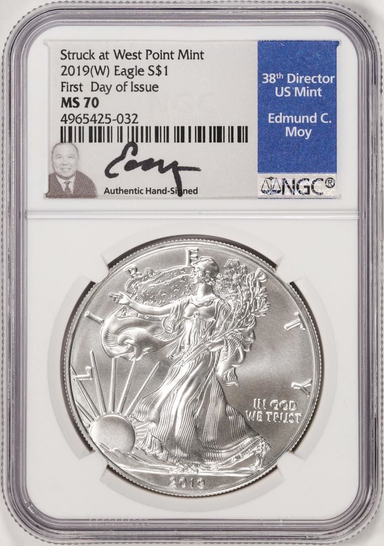 2019(W) $1 American Silver Eagle Coin NGC MS70 FDOI Moy Signature West Point Mint