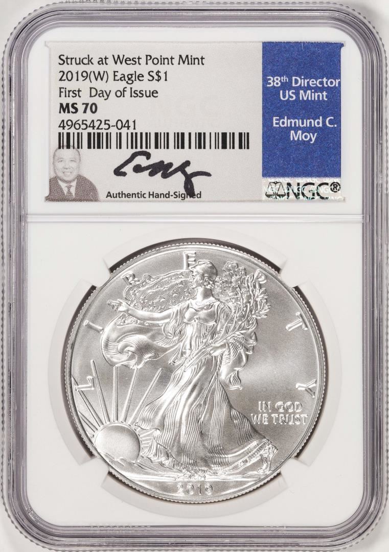 One 2019(W) $1 American Silver Eagle Coin NGC MS70 FDOI Moy Signature West Point Mint. NGC Certified.