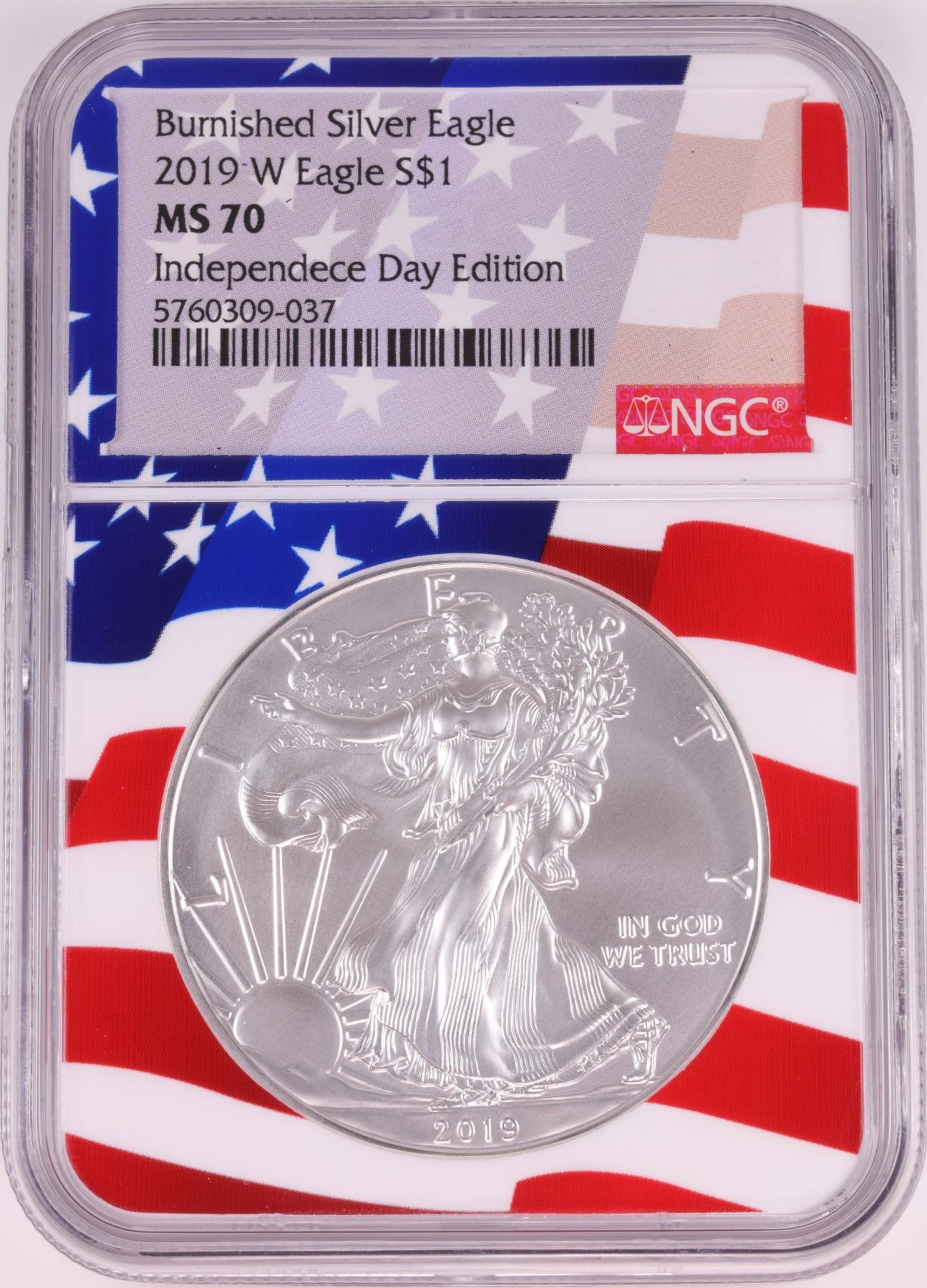 2019-W $1 Burnished American Silver Eagle Coin NGC MS70 Independence Day Flag Core