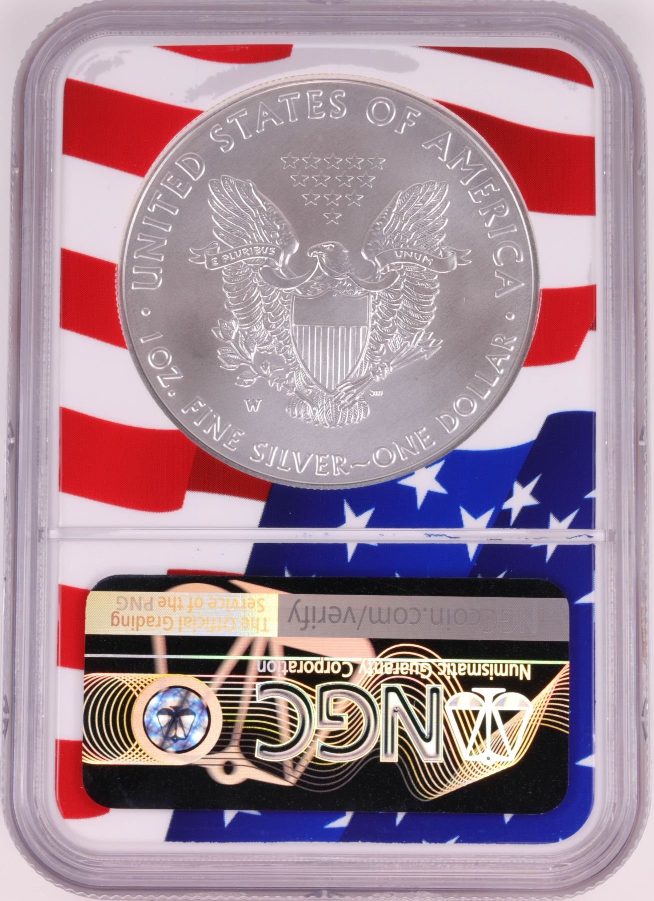 One 2019-W $1 Burnished American Silver Eagle Coin NGC MS70 Independence Day Flag Core.