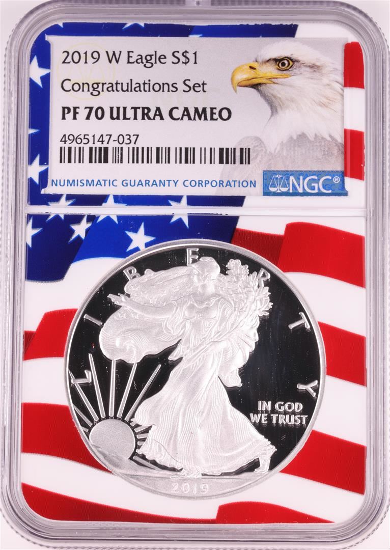2019-W $1 Proof American Silver Eagle Coin NGC PF70 Ultra Cameo Congratulations Flag
