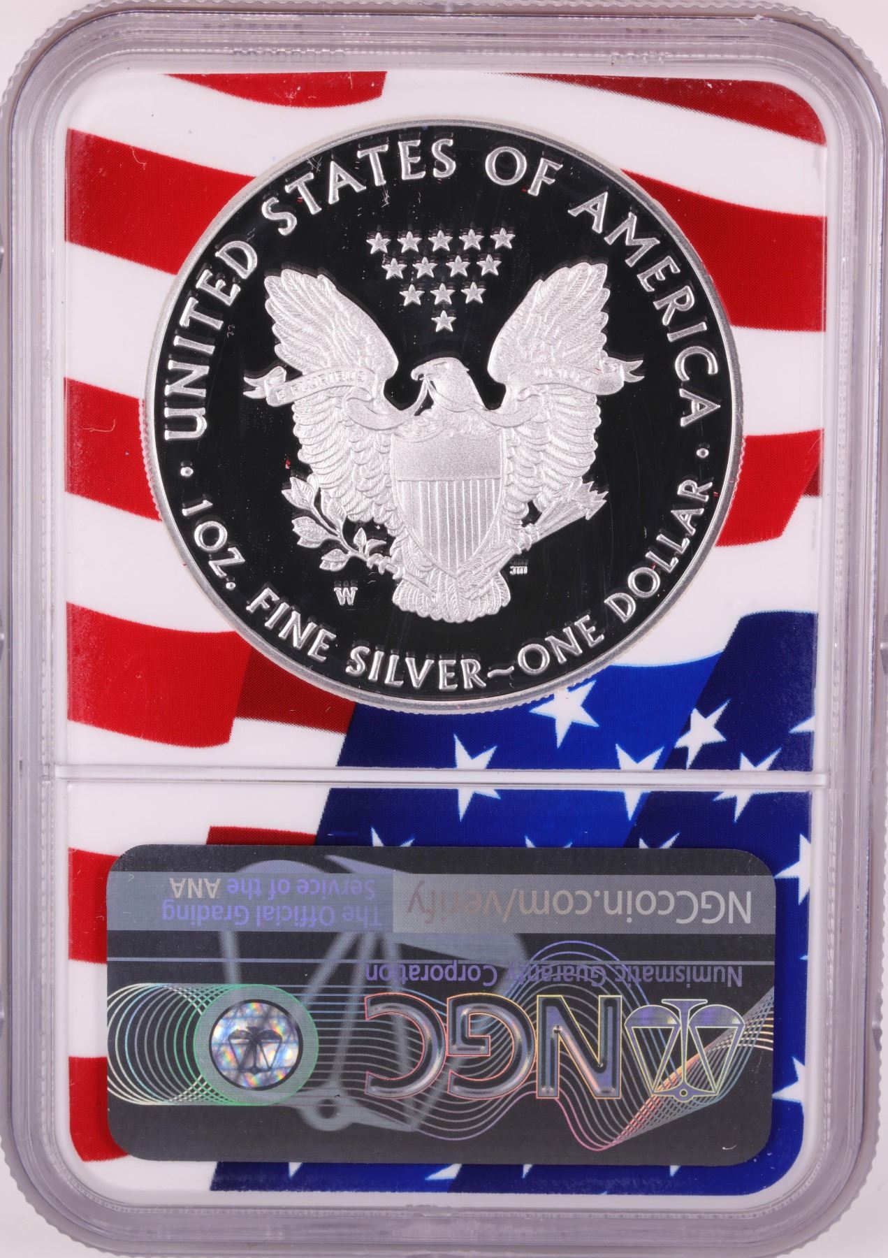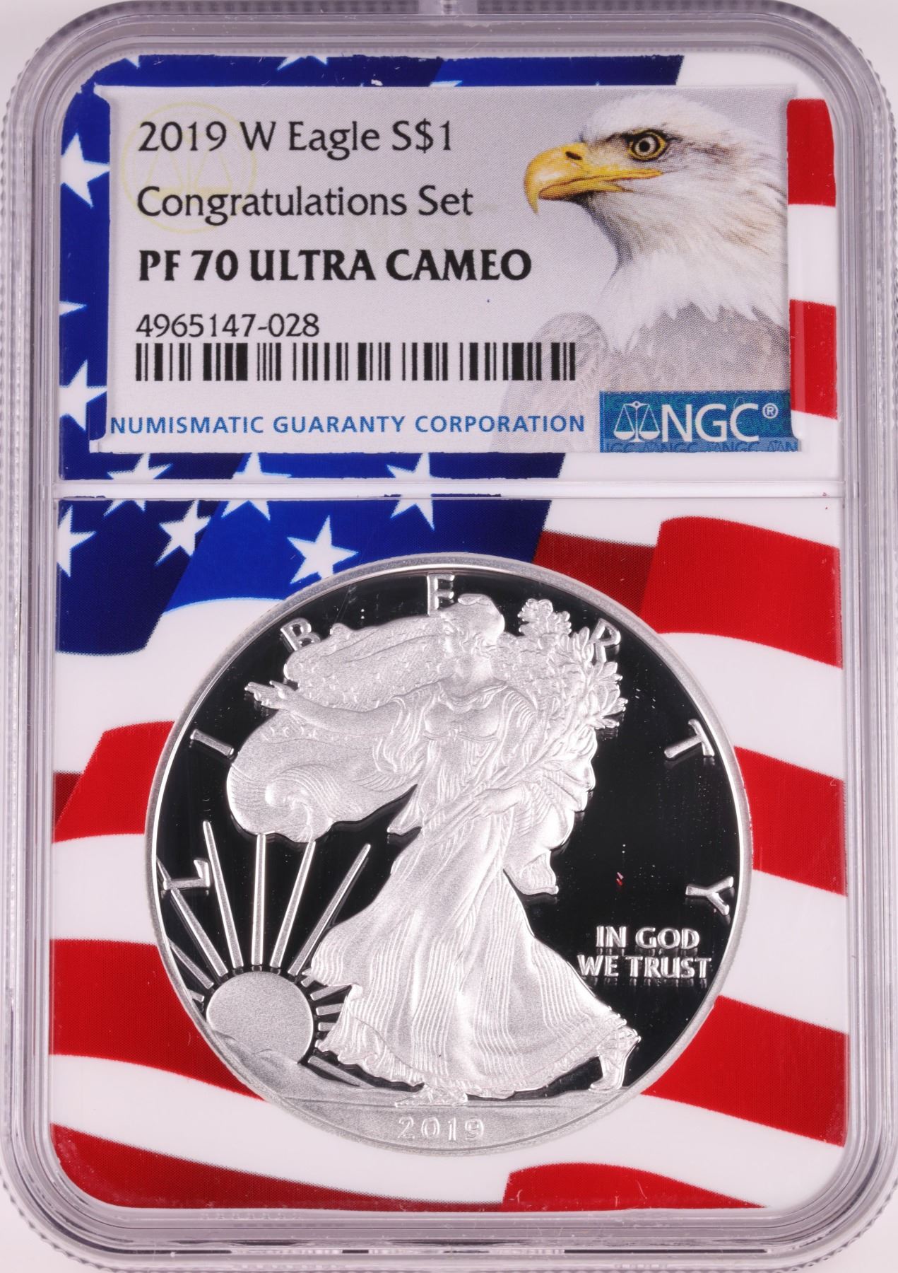 One 2019-W $1 Proof American Silver Eagle Coin NGC PF70 Ultra Cameo Congratulations Flag.