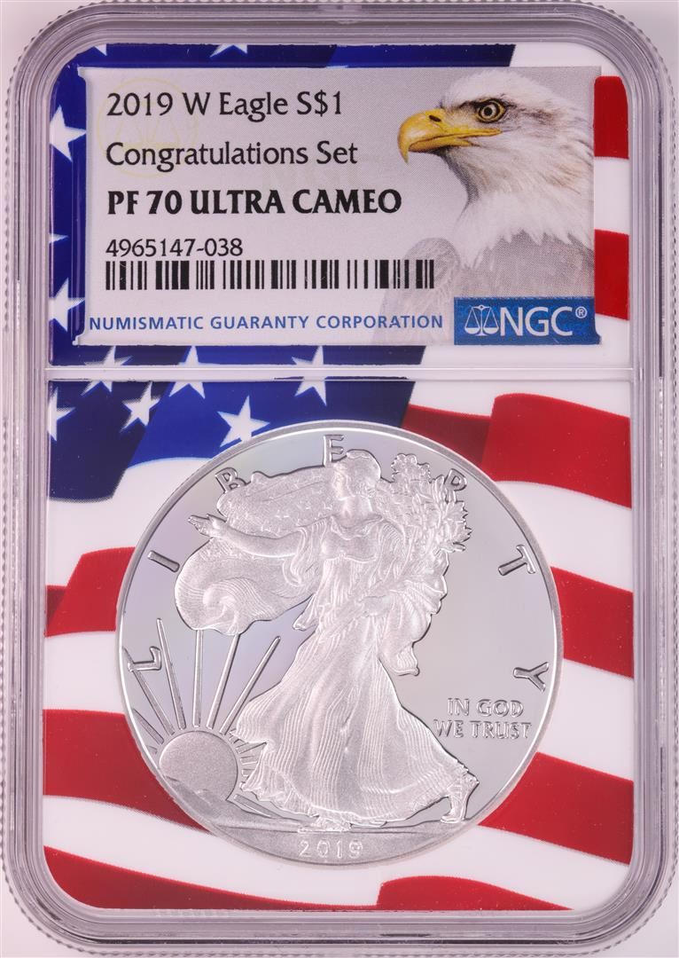 2019-W $1 Proof American Silver Eagle Coin NGC PF70 Ultra Cameo Congratulations Flag