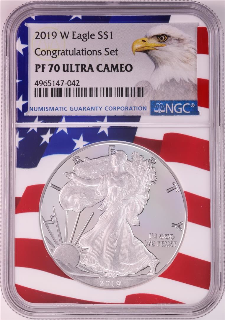 One 2019-W $1 Proof American Silver Eagle Coin NGC PF70 Ultra Cameo Congratulations Flag. NGC Certified.