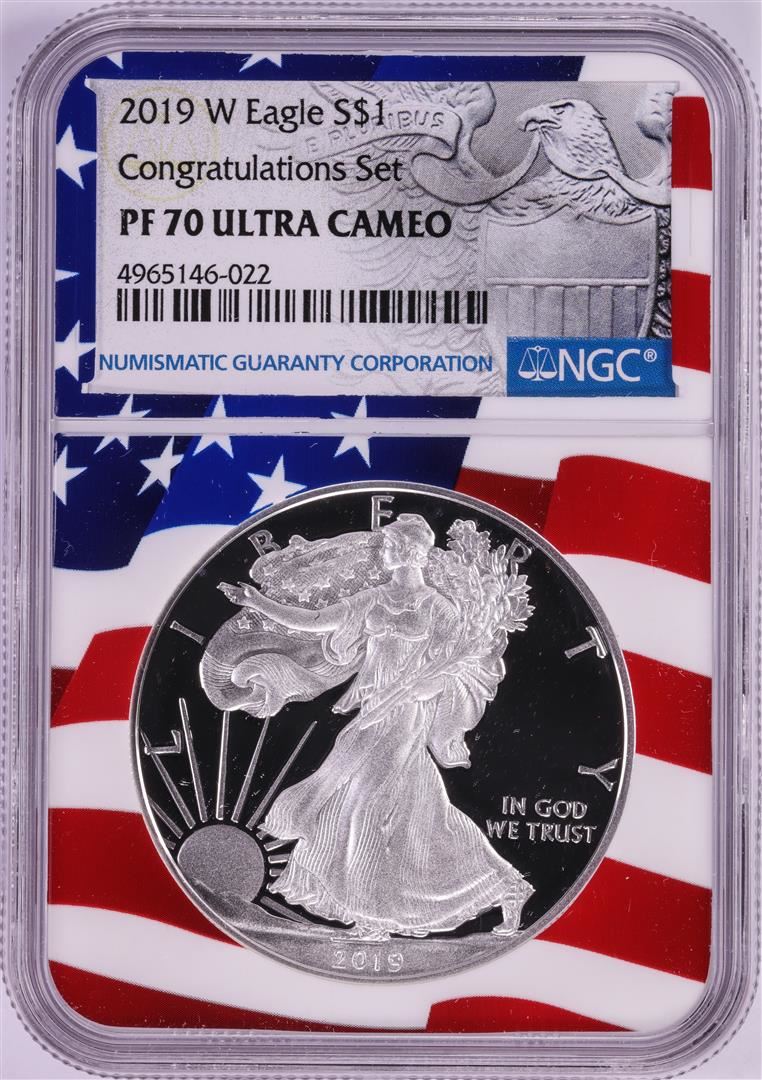 2019-W $1 Proof American Silver Eagle Coin NGC PF70 Ultra Cameo Congratulations Flag