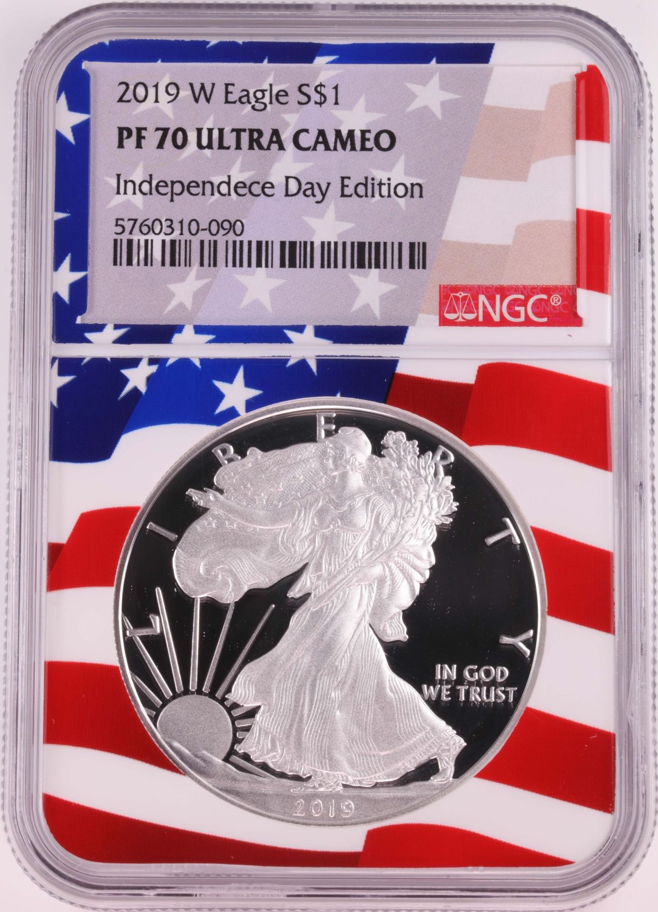 2019-W $1 Proof American Silver Eagle Coin NGC PF70 Ultra Cameo Independence Day Flag