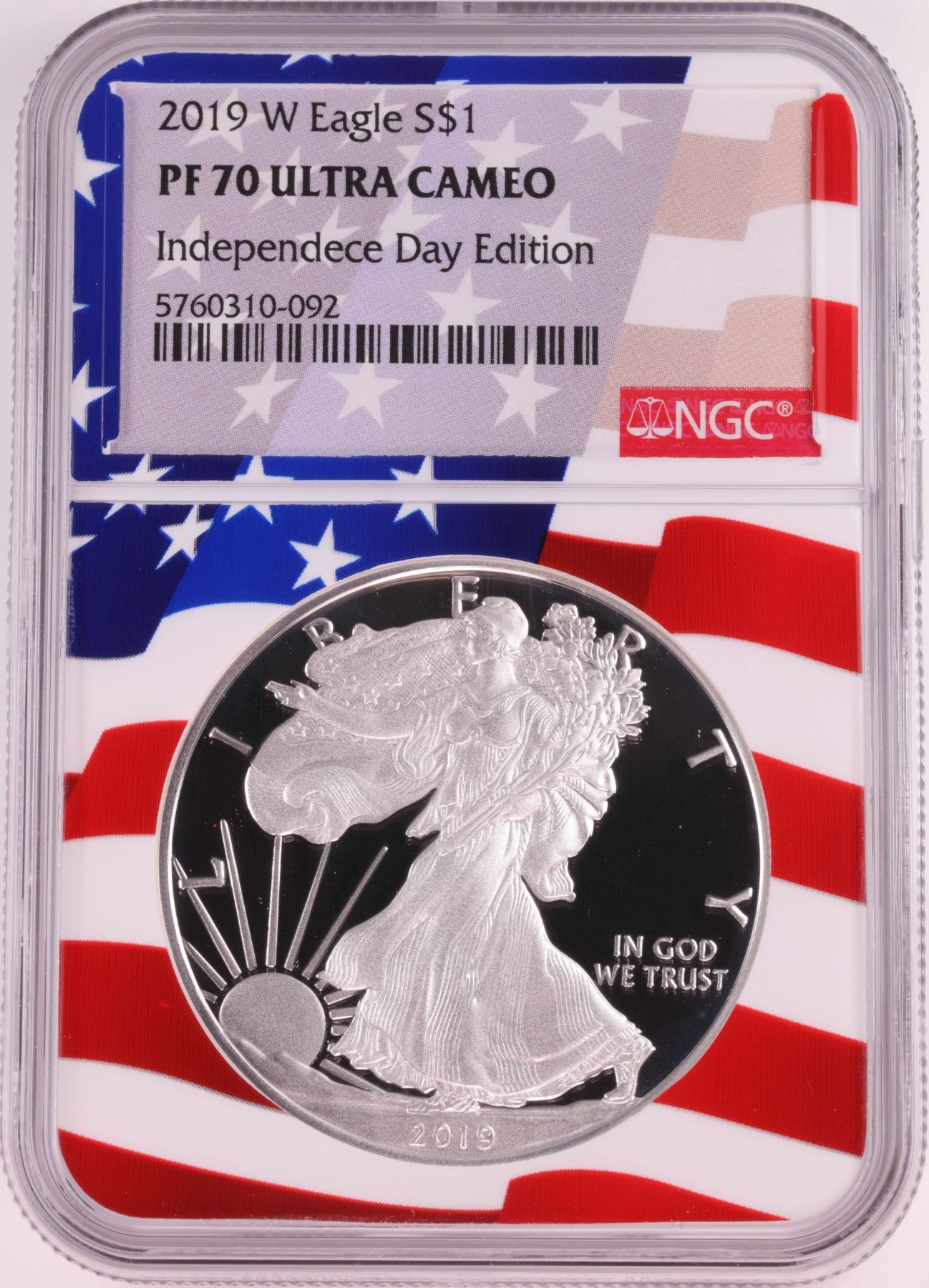 2019-W $1 Proof American Silver Eagle Coin NGC PF70 Ultra Cameo Independence Day Flag