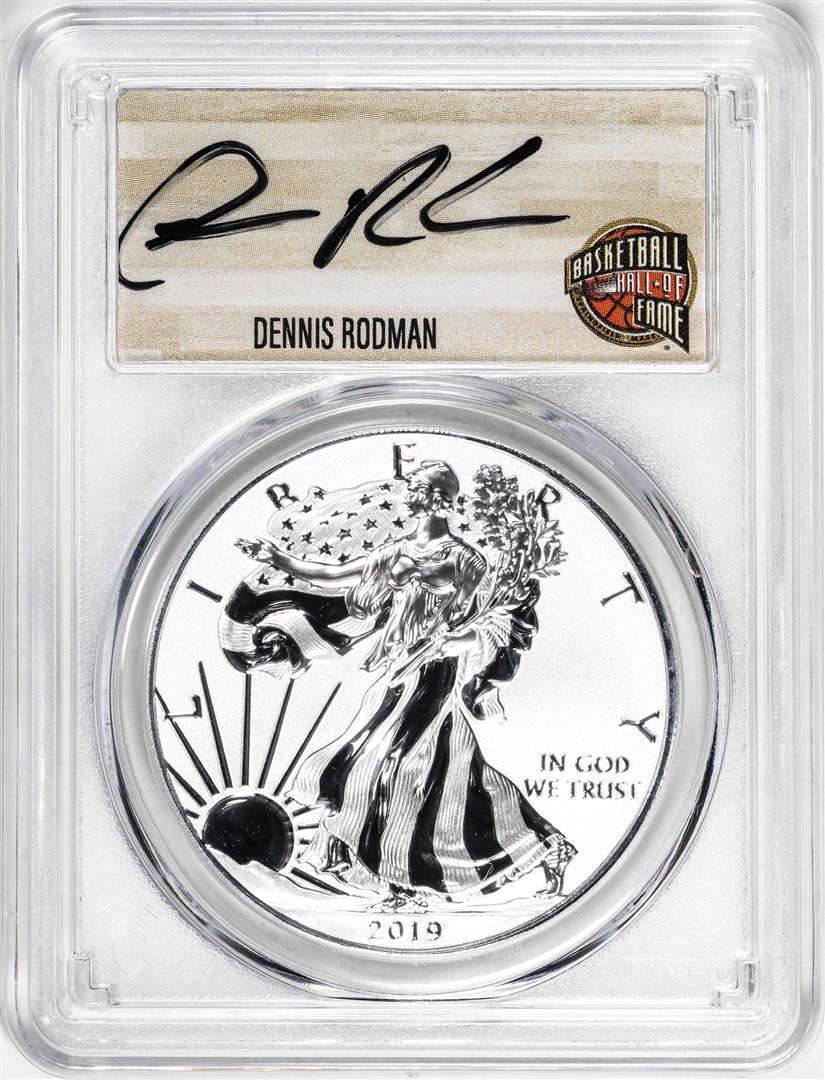 One 2019-W $1 Reverse Proof Silver Eagle Coin PCGS PR70 HOF Dennis Rodman Signature. PCGS Graded.