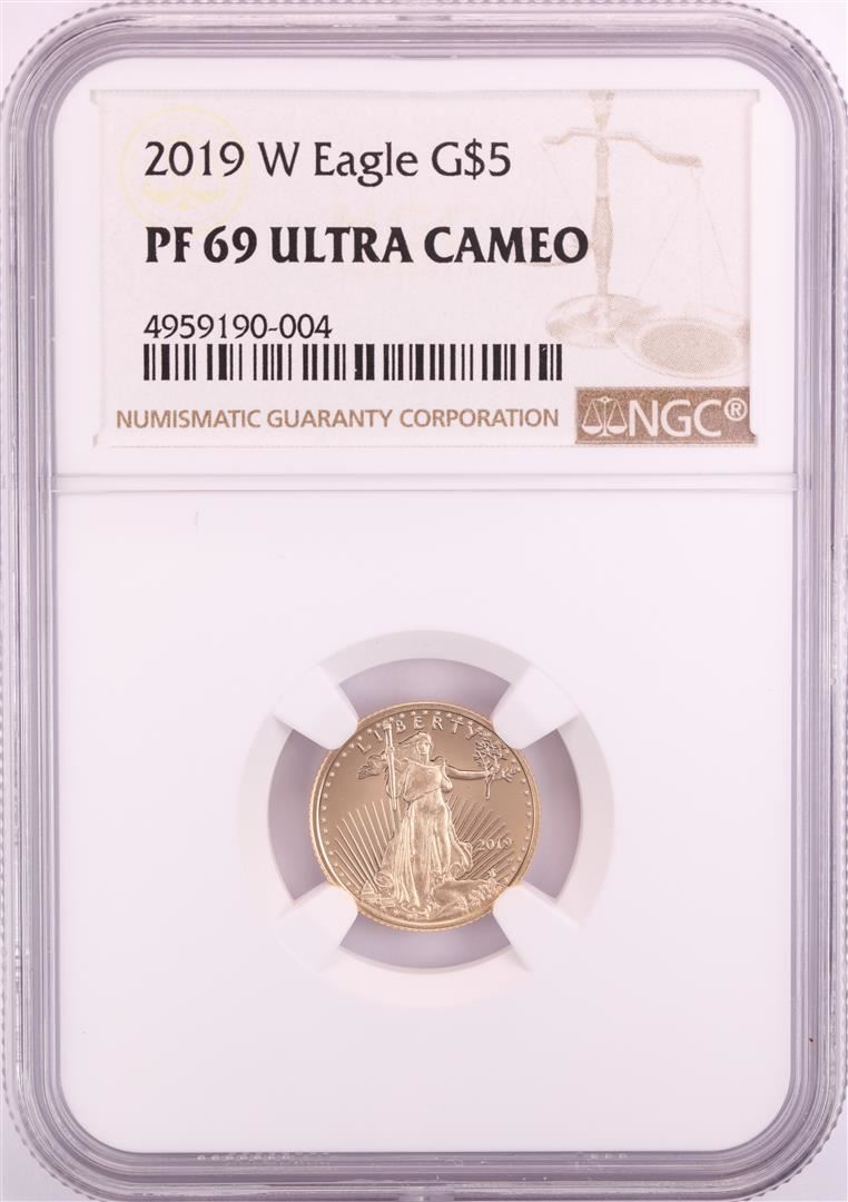 One 2019-W $5 Proof American Gold Eagle Coin NGC PF69 Ultra Cameo. NGC Certified.