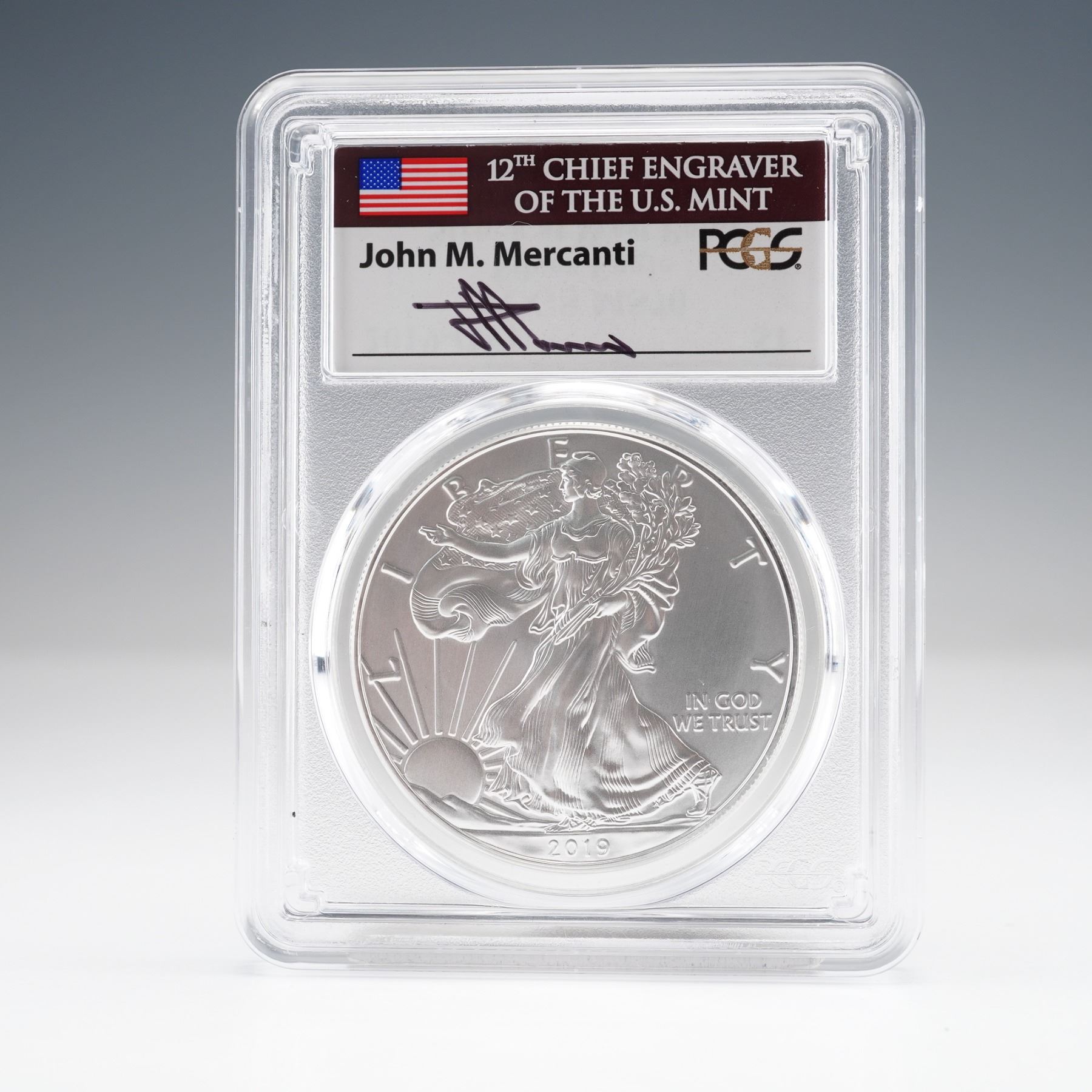 This 2019-(W) American Silver Eagle one-dollar coin, struck at the West Point Mint from one troy ounce of .999 fine silver, has been certified MS70 by the Professional Coin Grading Service. Bearing the "First Day of Issue" designation. The obverse, designed by Adolph A. Weinman, depicts Liberty striding gracefully toward the dawn, draped in the American flag and carrying branches of oak and laurel, symbolic of strength and peace. The liberty design is followed by the inscriptions LIBERTY, IN GOD WE TRUST, and the year below. The reverse, designed by John M. Mercanti, portrays a heraldic eagle with shield, clutching arrows and an olive branch beneath thirteen stars signifying the original colonies. It is surrounded by UNITED STATES OF AMERICA, 1 oz. FINE SILVER - ONE DOLLAR. Encapsulated and certified by PCGS for authenticity and preservation.
