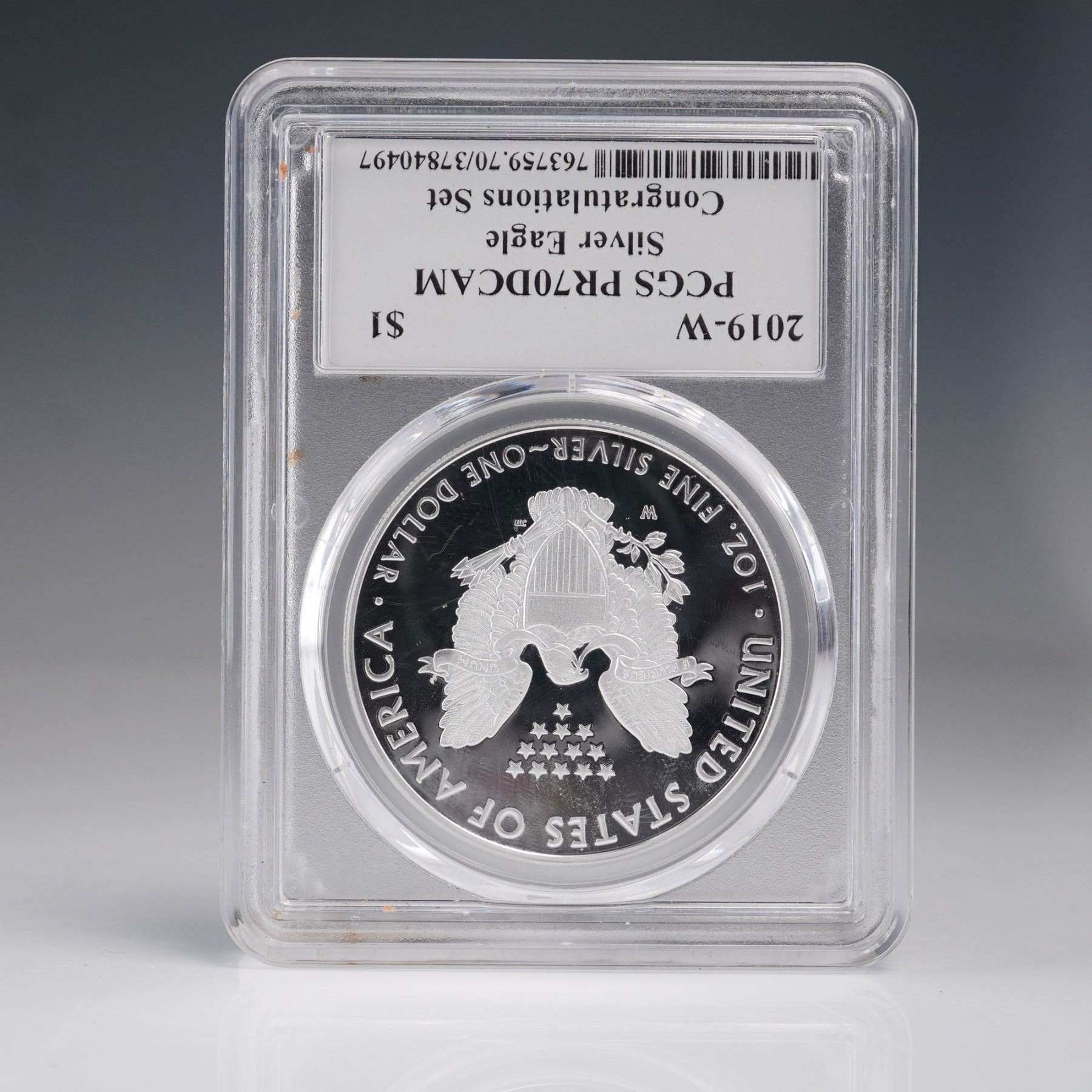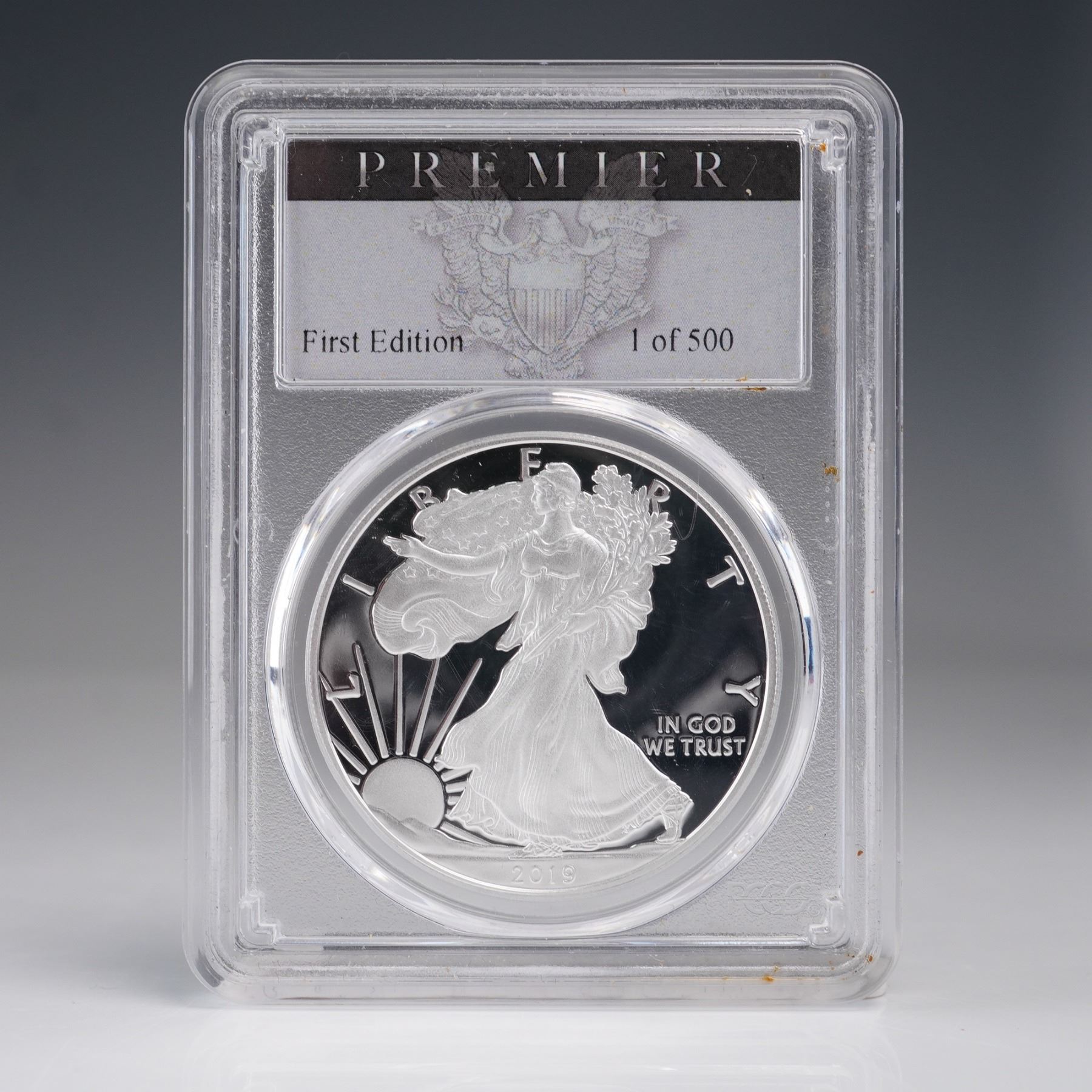 2019-W American Silver Eagle Type 1 dollar coin struck at the West Point Mint. This coin is graded PR70DCAM by PCGS and encapsulated in a tamper-evident holder labeled "Premier, First Edition, 1 of 500." Issued as part of the "Congratulations Set," this coin is classified as a deep cameo proof with flawless surfaces and mirror-like fields. The obverse features Adolph A. Weinman's iconic "Walking Liberty" design, originally used on the half dollar from 1916 to 1947. Liberty is depicted in full stride toward the rising sun, draped in the American flag, with her right hand extended and branches of laurel and oak in her left, symbolizing civil and military glory. The inscriptions include "LIBERTY," "IN GOD WE TRUST," and the year "2019." The reverse, designed by John Mercanti, displays a heraldic eagle with a shield, grasping an olive branch in its right talon and arrows in its left. Above the eagle are thirteen five-pointed stars arranged in a triangular formation, representing the original thirteen colonies. The inscriptions read "UNITED STATES OF AMERICA," "1 OZ. FINE SILVER - ONE DOLLAR," and "E PLURIBUS UNUM." The "W" mintmark is visible below the eagle's left wing. This PR70DCAM example is part of a limited First Edition of 500 certified coins, making it a notable addition for collectors of modern American coinage and proof silver eagles. Slab: 2.5"L x 0.25"W x 3.25"H. Coin diameter: 39mm.