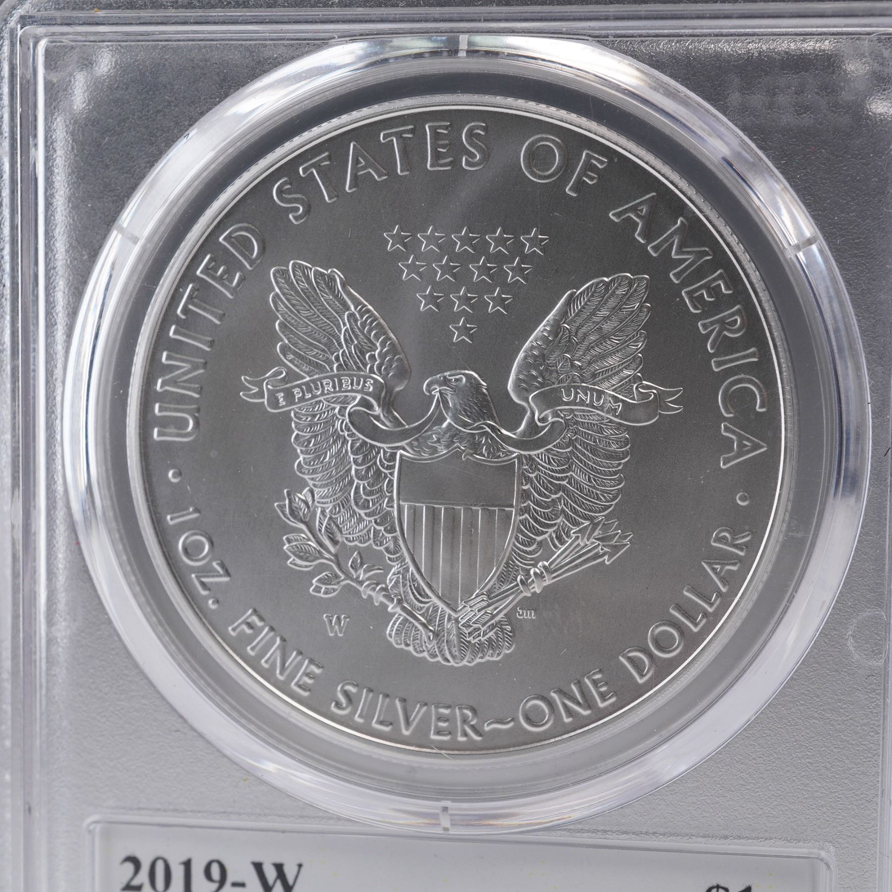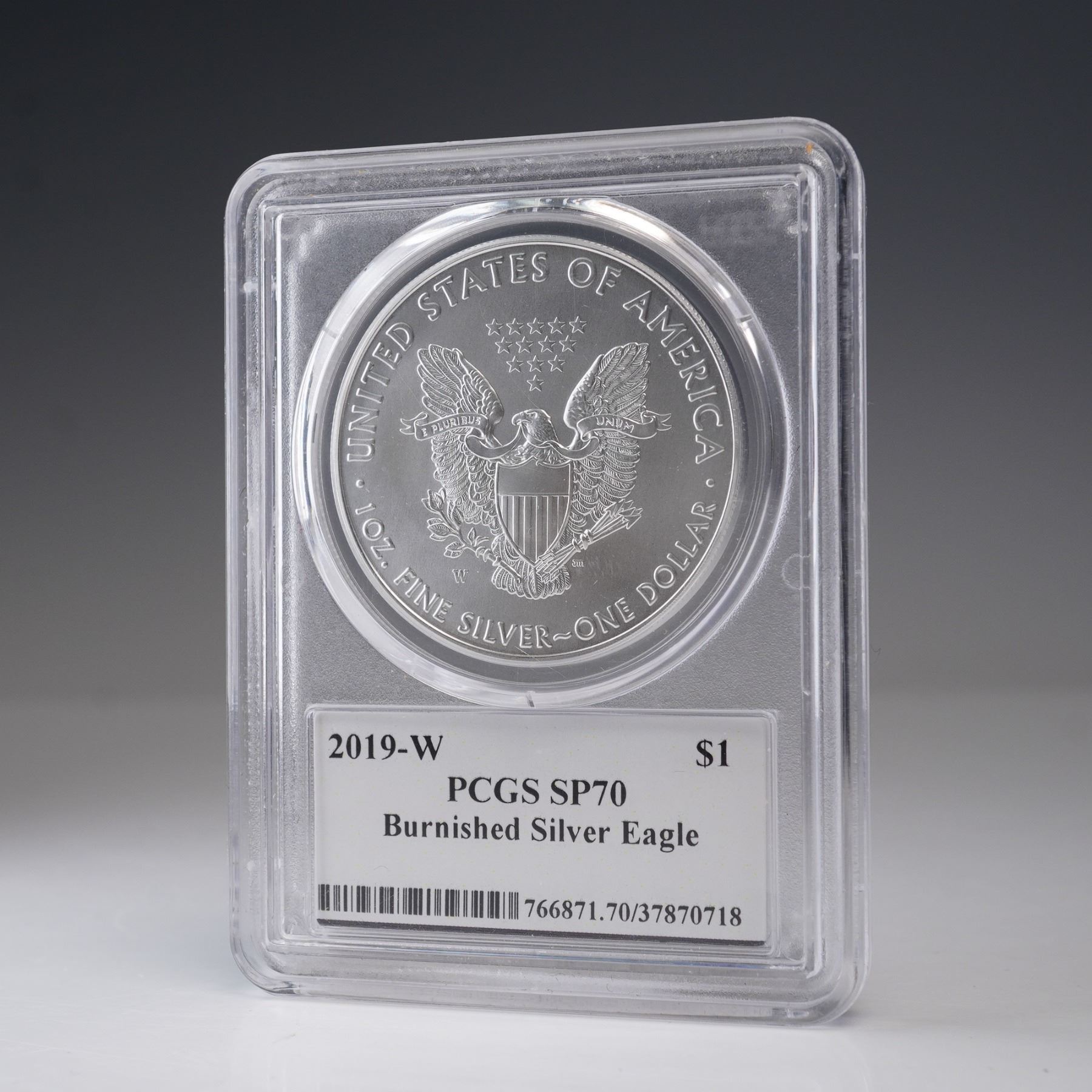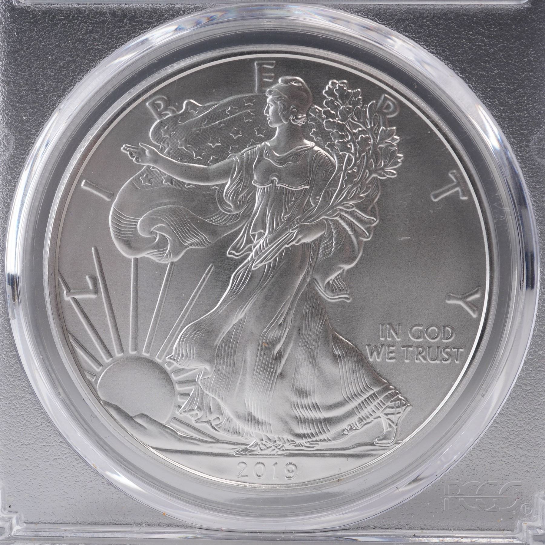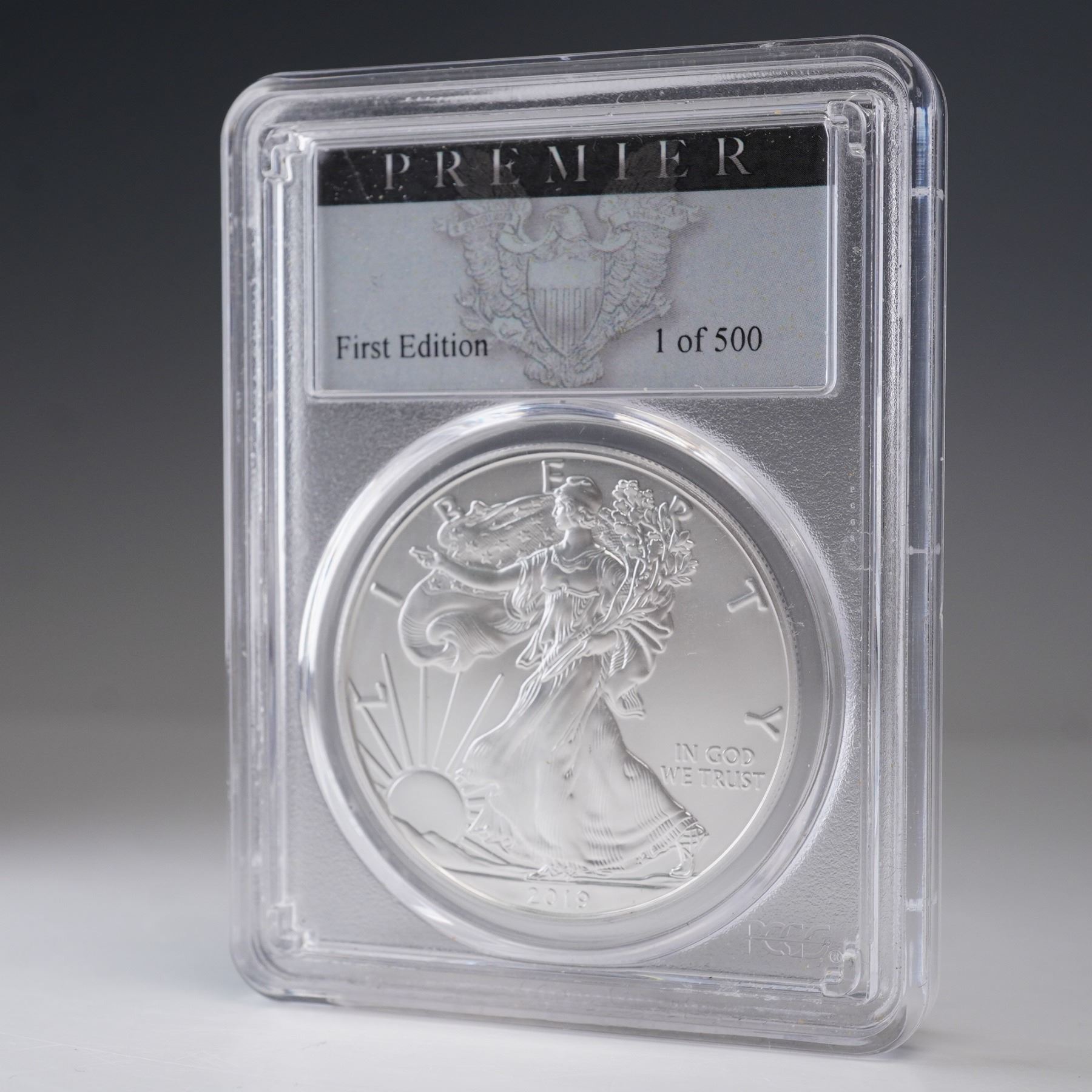 Struck at the West Point Mint, this 2019-W American Silver Eagle is a burnished one-ounce coin composed of .999 fine silver and holds a face value of one dollar. The obverse features the iconic Walking Liberty design by Adolph A. Weinman, depicting Liberty in full stride, draped in the American flag, her right arm outstretched and her left holding branches of laurel and oak. The reverse showcases the heraldic eagle design created by John Mercanti, presenting the American eagle with outstretched wings behind a shield, clutching an olive branch in one talon and arrows in the other. Thirteen stars are positioned above the eagle, representing the original colonies. This coin is PCGS graded SP70, the highest possible grade on the scale for a specimen strike, indicating a flawless surface and sharp detail. The holder indicates it is a First Edition from a limited issue of 500 coins and is labeled PREMIER by PCGS. Slab: 2.5"L x 0.5"W x 3.25"H. Coin diameter: 39mm.