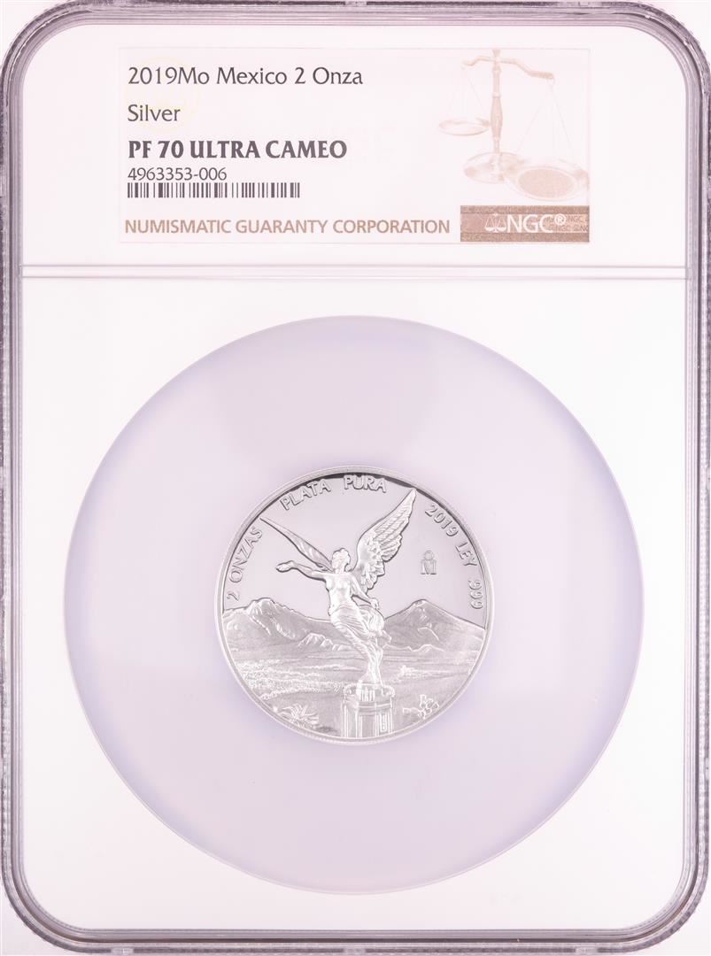 One 2019Mo Mexico Proof 2 Onza Silver Coin NGC PF70 Ultra Cameo. NGC Certified.
