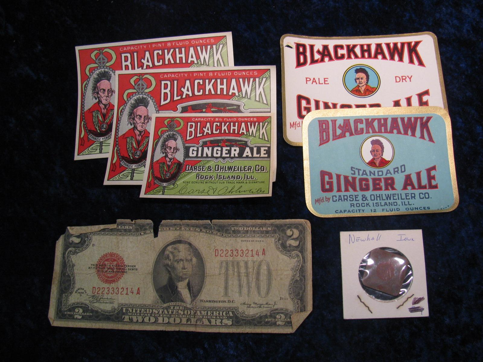 202. (4) Blackhawk Ginger Ale Bottle Labels; Newhall, Ia. Good For token; Series 1928 D $2.00 U.S. note.