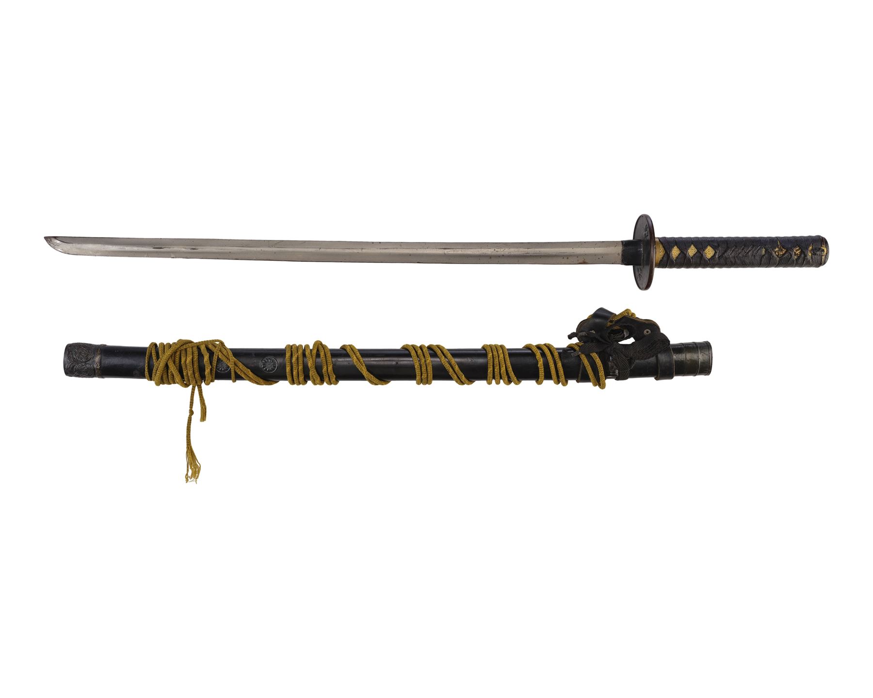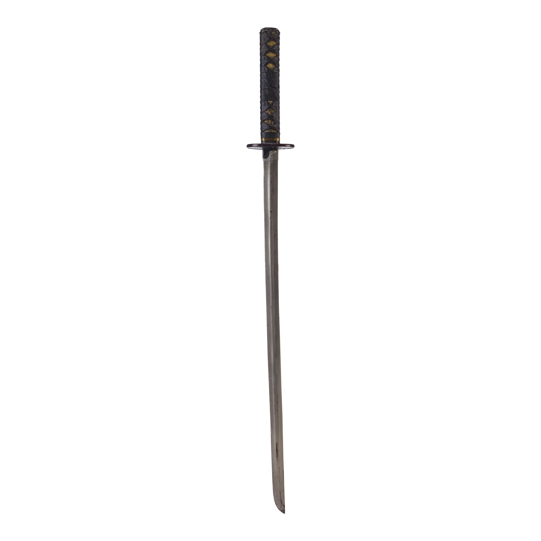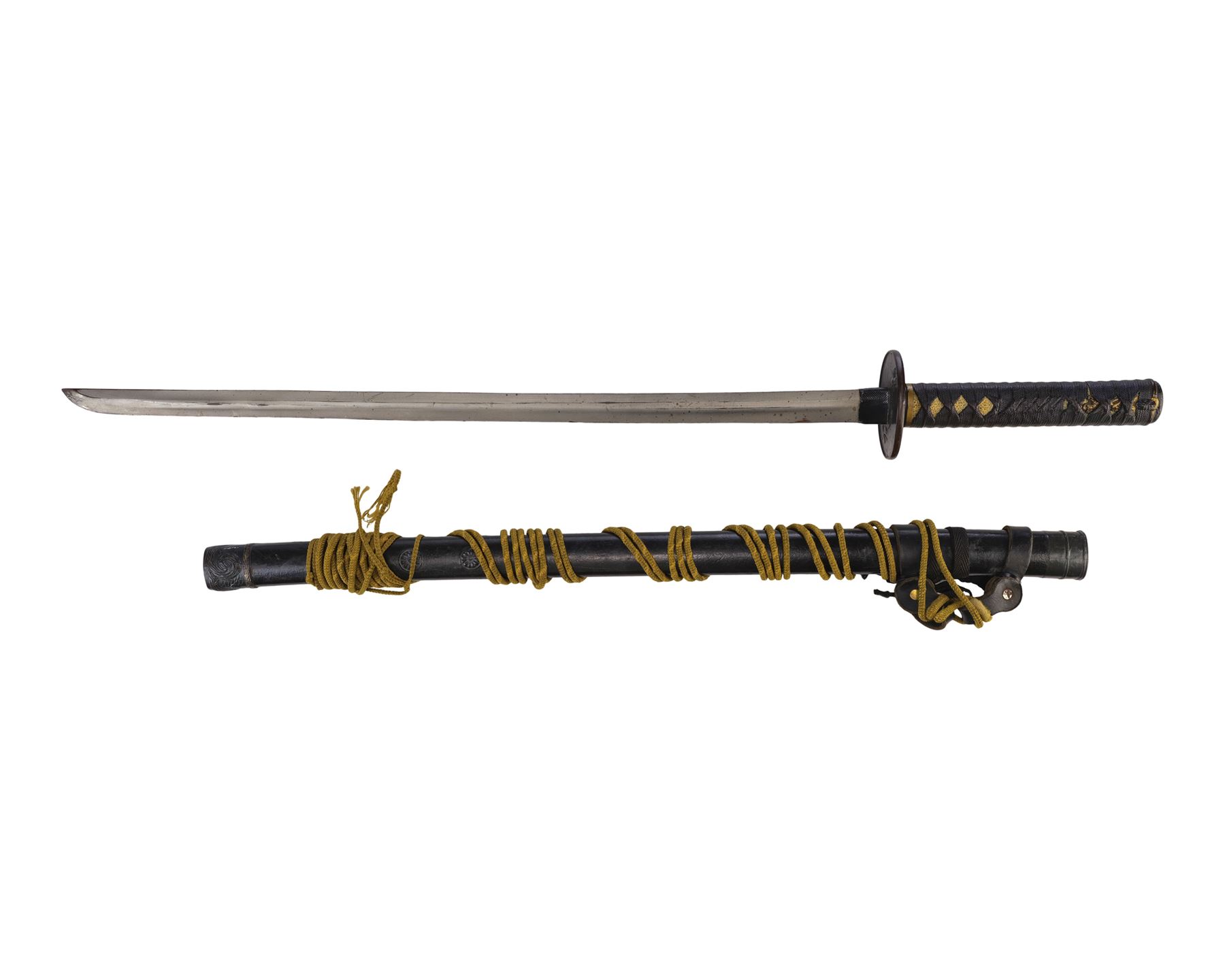 The katana exhibits discoloration along the blade and corded wrapping, as well as scuffing on the tsuba and a buildup of grime in the final detailed crevices of the textured handle and decorative tip on the tsuba. Dimensions: (sheathed) 39" x 3.5" x 3.5" (99 cm x 9 cm x 9 cm)