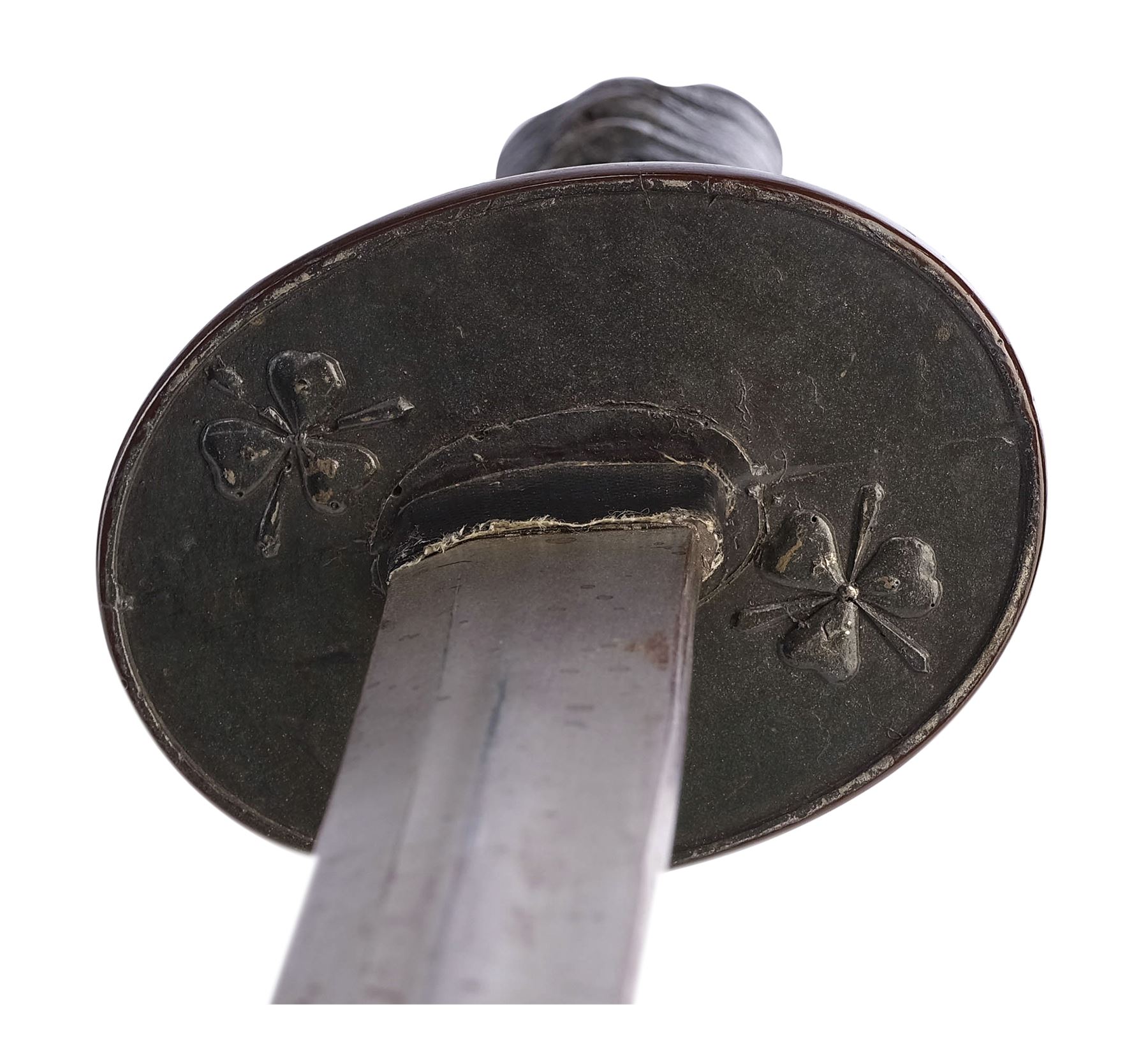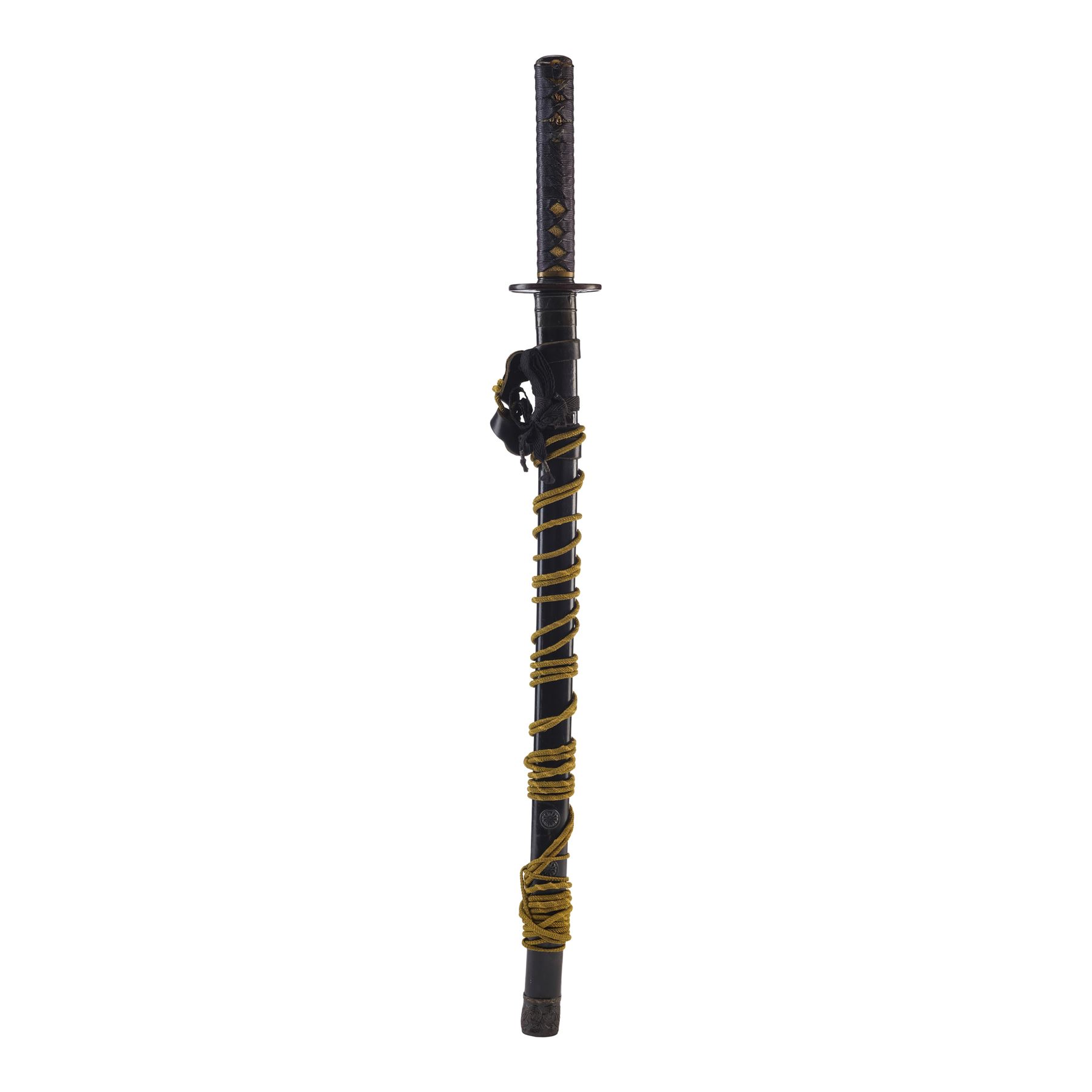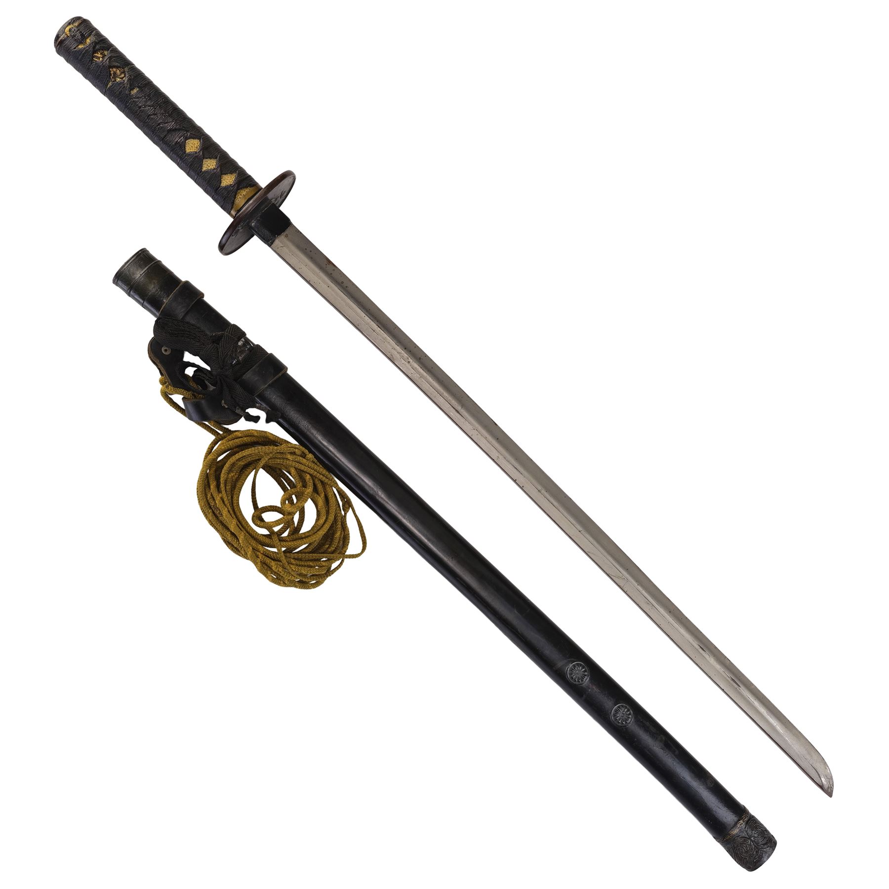 The katana exhibits discoloration along the blade and corded wrapping, as well as scuffing on the tsuba and a buildup of grime in the final detailed crevices of the textured handle and decorative tip on the tsuba. Dimensions: (sheathed) 39" x 3.5" x 3.5" (99 cm x 9 cm x 9 cm)