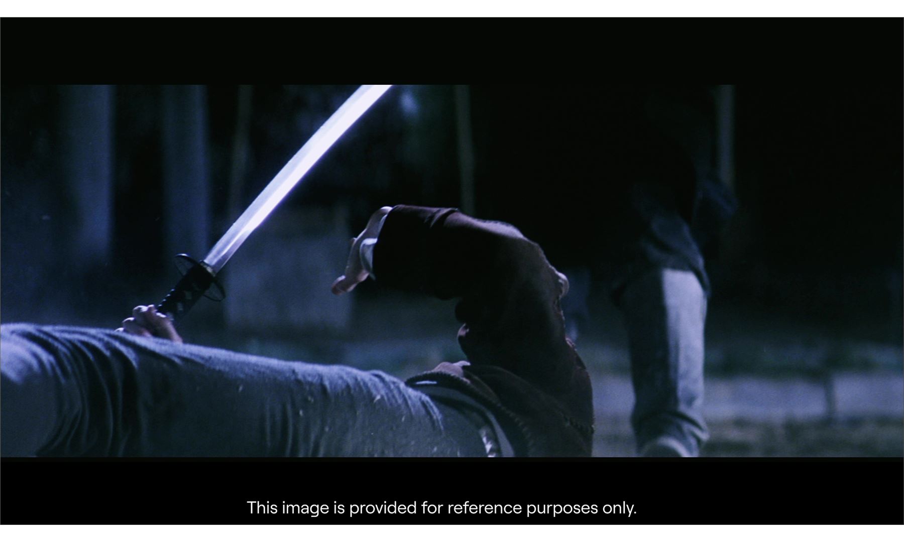 Created by WETA Workshop, this dense polyurethane rubber katana originated from a crew member. It is cast around a metal core with textured gold-color tsuka painted to appear woven with a black leather tsuka ito, a rigid polyurethane rubber tsuba painted black, a bronze-color hibaki, and a blade painted in two tones of silver-color to appear sharp. Also included is a polyurethane scabbard engraved with floral patterns and wrapped with gold-color cord designed to be tied to Algren's waist during the battle scene.