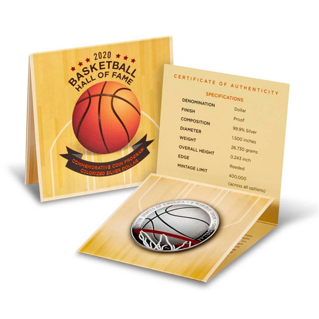One 2020 $1 Proof Basketball HOF Colorized Commemorative Silver Dollar Coin w/ COA & Box.
