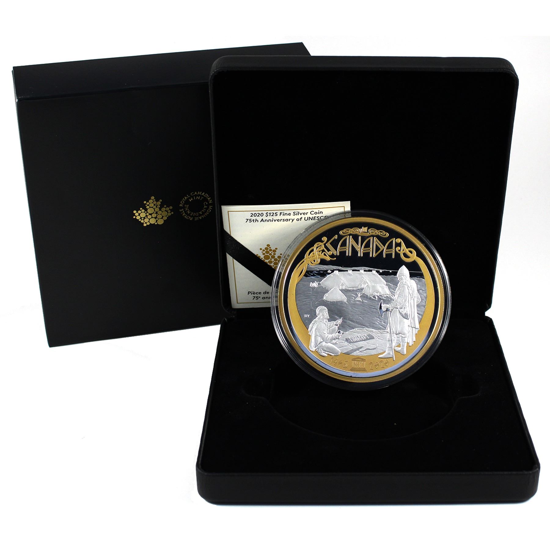 2020 $125 75th Anniversary of UNESCO, Fine Silver Coin With Selective Gold Plating. Very Low Mintage of Only 300!! Minor dents and scuffs to clamshell and outer sleeve. (Tax Exempt)