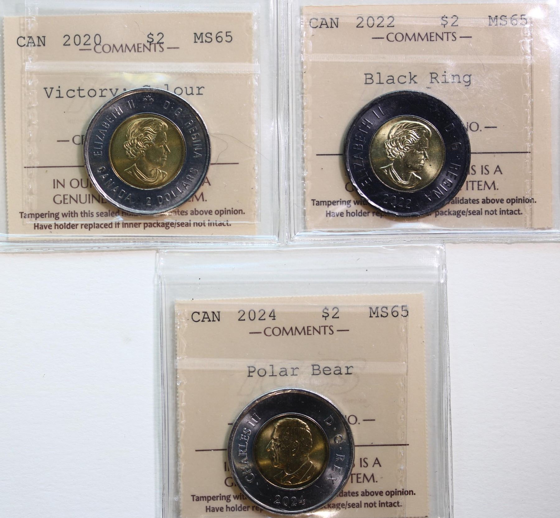 2020 $2 "Victory; Colour", 2022 "Black Ring", 2024 "Polar Bear". Lot of 3 coins ICCS Gem Mint State-65